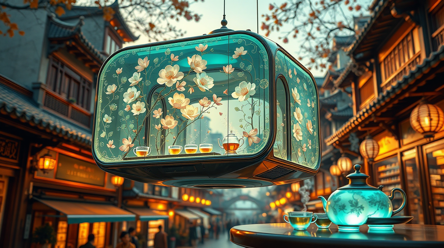 作图提示词:A futuristic Cantonese tea house floating above the traditional arcade streets of Guangzhou at dawn, with programmable Lingnan carved glass walls projecting dynamic 3D holograms of lychee and kapok flowers that shift with the morning light. Photon teapots automatically circulate, brewing tea whose aromatic molecules condense into glowing poetic verses in the air. The scene blends advanced quantum technology with traditional architecture in a serene morning atmosphere, captured from a low-angle perspective with shallow depth of field to softly blur the arcade outlines in the background, using warm golden hour lighting to enhance the fusion of past and future.