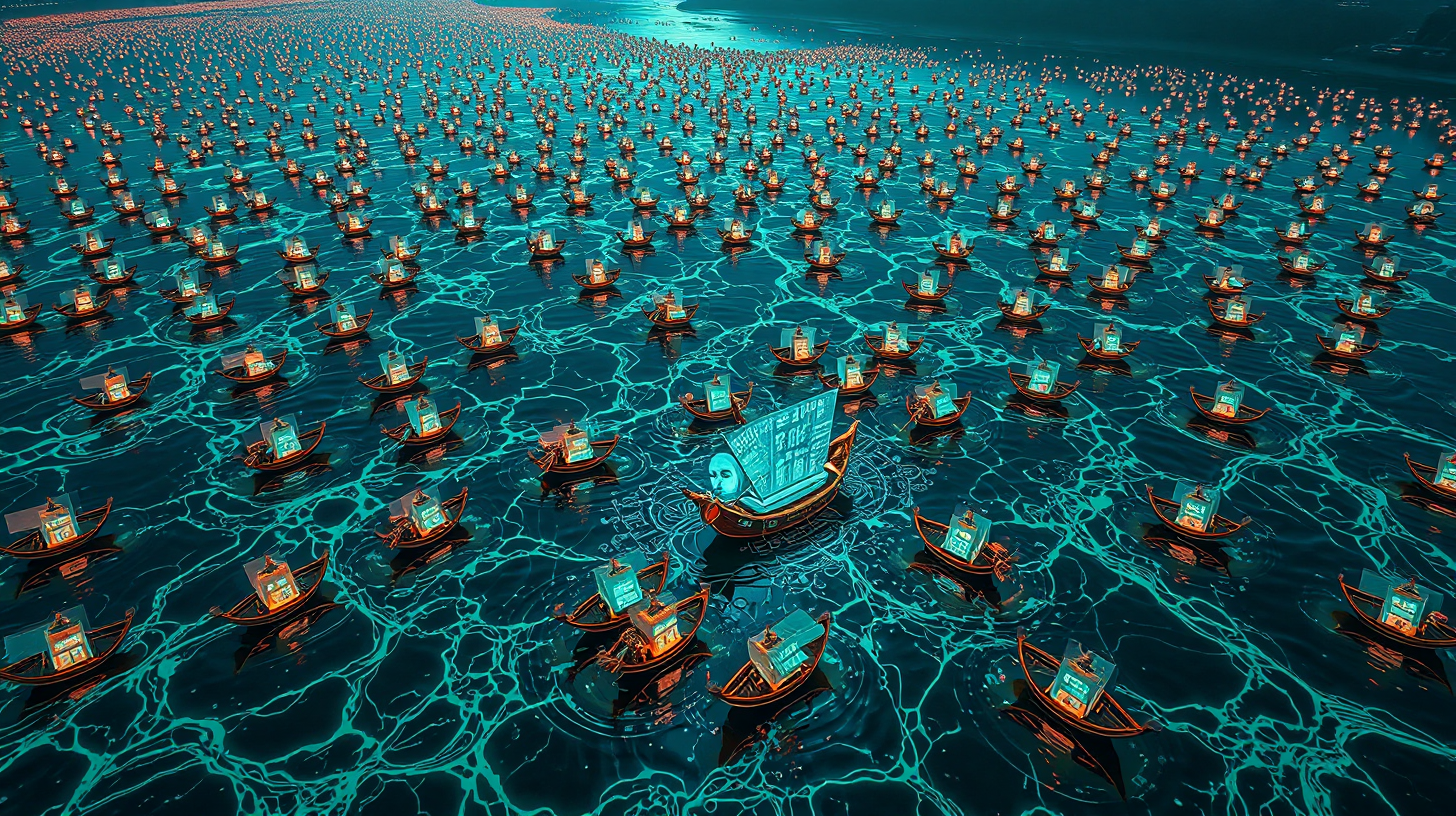 作图提示词:A bird’s-eye view of the Pearl River surface alive with bioluminescent data streams, where millions of nano-scale dragon boat-shaped monitors form intricate digital totems. Suddenly, a water quality fluctuation triggers the monitors to transform into purification units, performing a synchronized mechanical ballet on the water’s surface that projects a holographic Cantonese opera mask alert interface. The scene is captured with high dynamic range to balance the neon glow of the data streams against the dark water, using a telephoto lens to compress the perspective and emphasize the patterns.