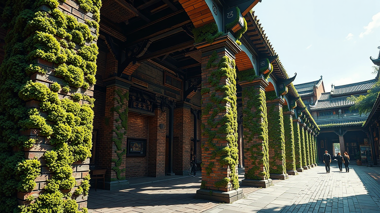 作图提示词:A 45-degree angled view of Xiguan arcade columns covered in quantum moss matrices, these photosynthetic intelligent plants converting century-old brick wall wear patterns into growing textures. The entire arcade suddenly projects holographic memories of the Thirteen Hongs trading history, with light and shadow playing through the carved gaps as the ancient architecture is revitalized by technology. Shot with a medium focal length to balance architectural detail and environmental context, using side lighting to enhance the texture of both the moss and brickwork.