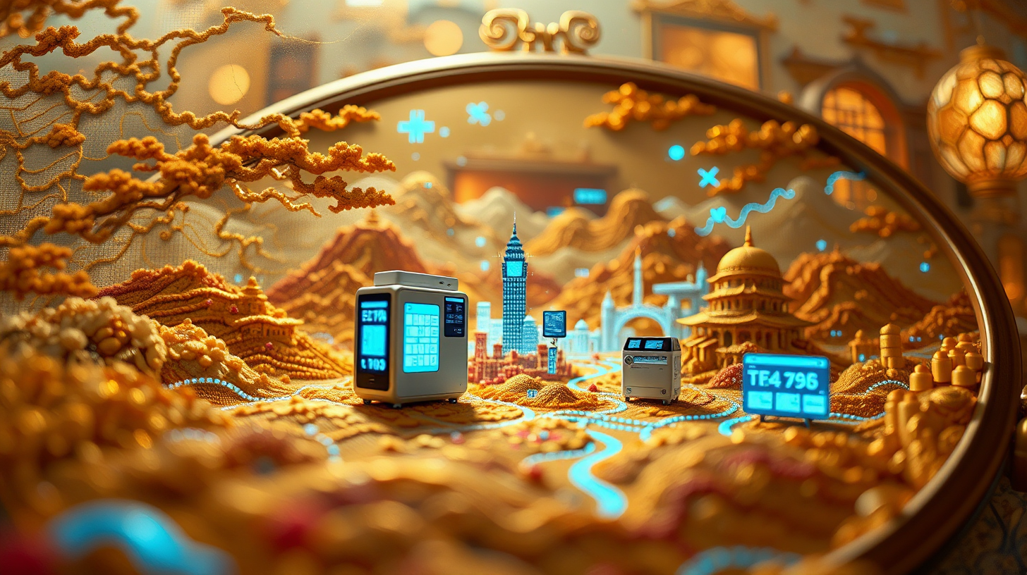 作图提示词:A close-up view of an intelligent embroidery frame inside the Chen Clan Ancestral Hall, where digital Cantonese embroidery dynamically weaves real-time city data streams into intricate Lingnan landscape patterns. Golden threads shimmer as the embroidery ripples and transforms into an interactive navigation map, with holographic medical units emerging seamlessly from the fabric. The scene is illuminated by soft ambient bioluminescent lighting, casting delicate shadows that highlight the embroidery’s hyper-detailed textures and the fluid motion of the medical interfaces. Shot with a macro lens at f/2.8 to create a shallow depth of field, focusing on the embroidery’s central transformation point while allowing the background elements to blur into a warm bokeh of traditional architectural details. Color palette blends rich golds and deep reds of traditional embroidery with cool blue data streams, creating a harmonious contrast between heritage and futurism.
