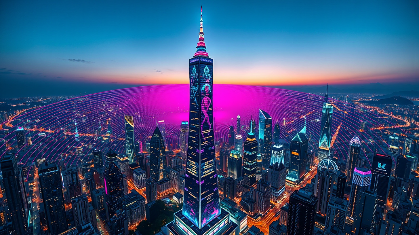 作图提示词:An ultra-wide aerial view of Canton Tower’s summit engulfed in a quantum resonance field that materializes a newborn Cantonese nursery rhyme into three-dimensional light fractals. The city’s skyscrapers respond in perfect synchronization, their smart glass facades transforming into massive audiovisual displays that pulse with chromatic harmonies. Captured at twilight with a long exposure to emphasize the light trails, using a 16mm lens to encompass the entire urban musical instrument. The composition follows the rule of thirds with the tower as the central focal point, surrounded by concentric waves of colored light radiating across the cityscape. Lighting combines the tower’s neon core with building facades reflecting prismatic hues, while the color grading emphasizes electric blues and magentas against the deep indigo twilight sky. The depth of field maintains sharpness from foreground to background to showcase the citywide scale of this technological symphony.