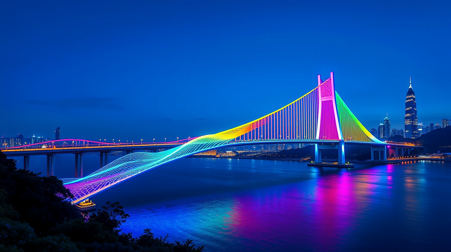 作图提示词:Wide-angle side view of the Shenzhen-Hong Kong photon bridge illuminated in rainbow frequencies during emotional resonance testing. Long exposure (2s) to capture undulating light patterns synchronized with citizen emotions, shot at blue hour for optimal color contrast. Telephoto compression at 200mm emphasizes bridge curvature, with foreground elements framing the composition. Lighting balances cool bridge LEDs with warm city glows, using polarization to reduce water reflections.