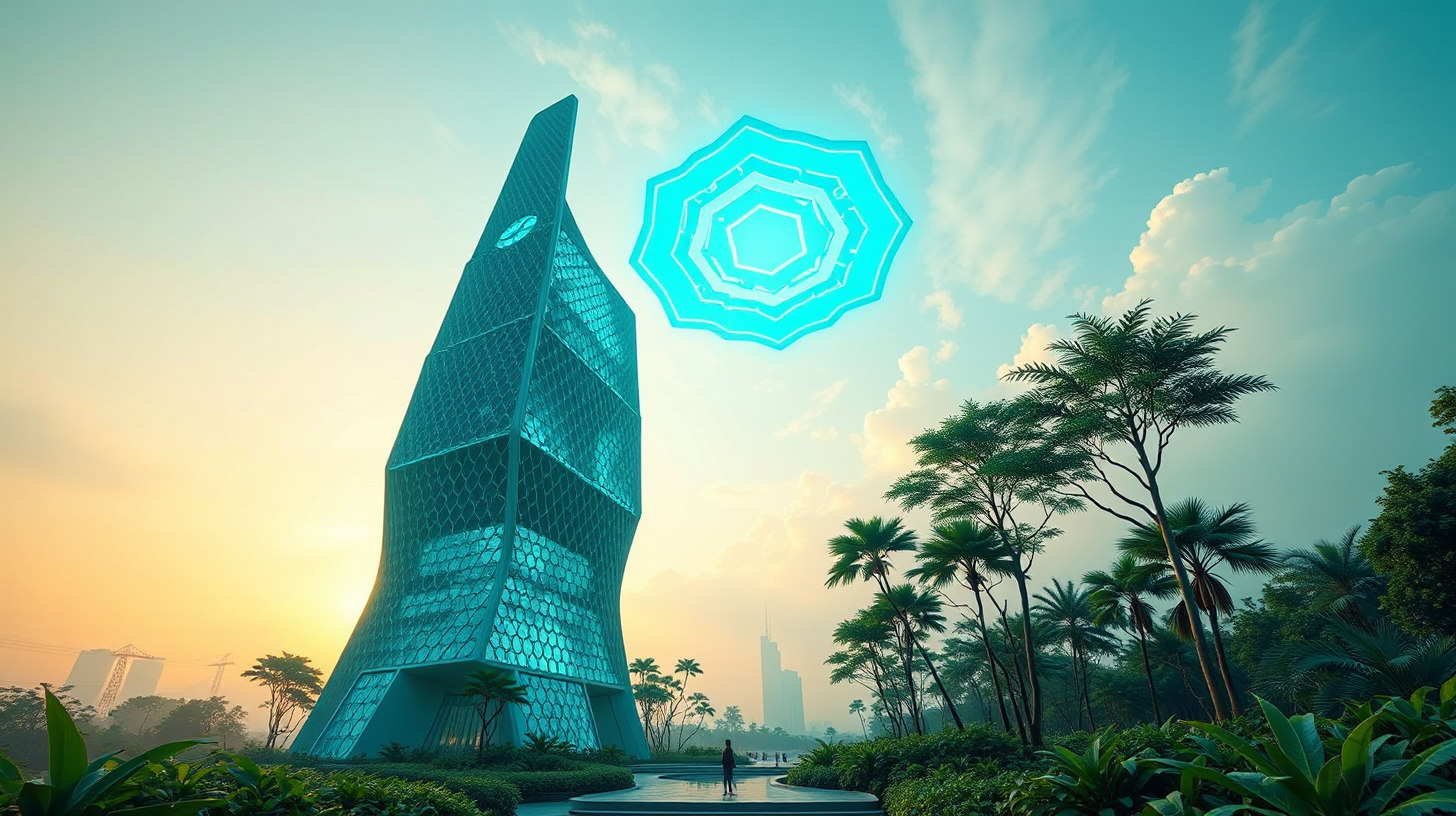 描述:晨曦像一层薄纱,轻轻覆盖在深圳湾的超高层建筑群上。那些发光的量子藤蔓如同苏醒的绿色精灵,沿着玻璃幕墙蜿蜒攀爬,每一片光伏叶片都像灵动的眼睑,随着阳光的强弱缓缓眨动,为整座城市编织着清洁能源的网络。微风拂过,藤蔓发出细碎的沙沙声,叶片间漏下的光斑在地面跳着不规则的舞蹈,仿佛在诉说科技与自然的温柔密语。