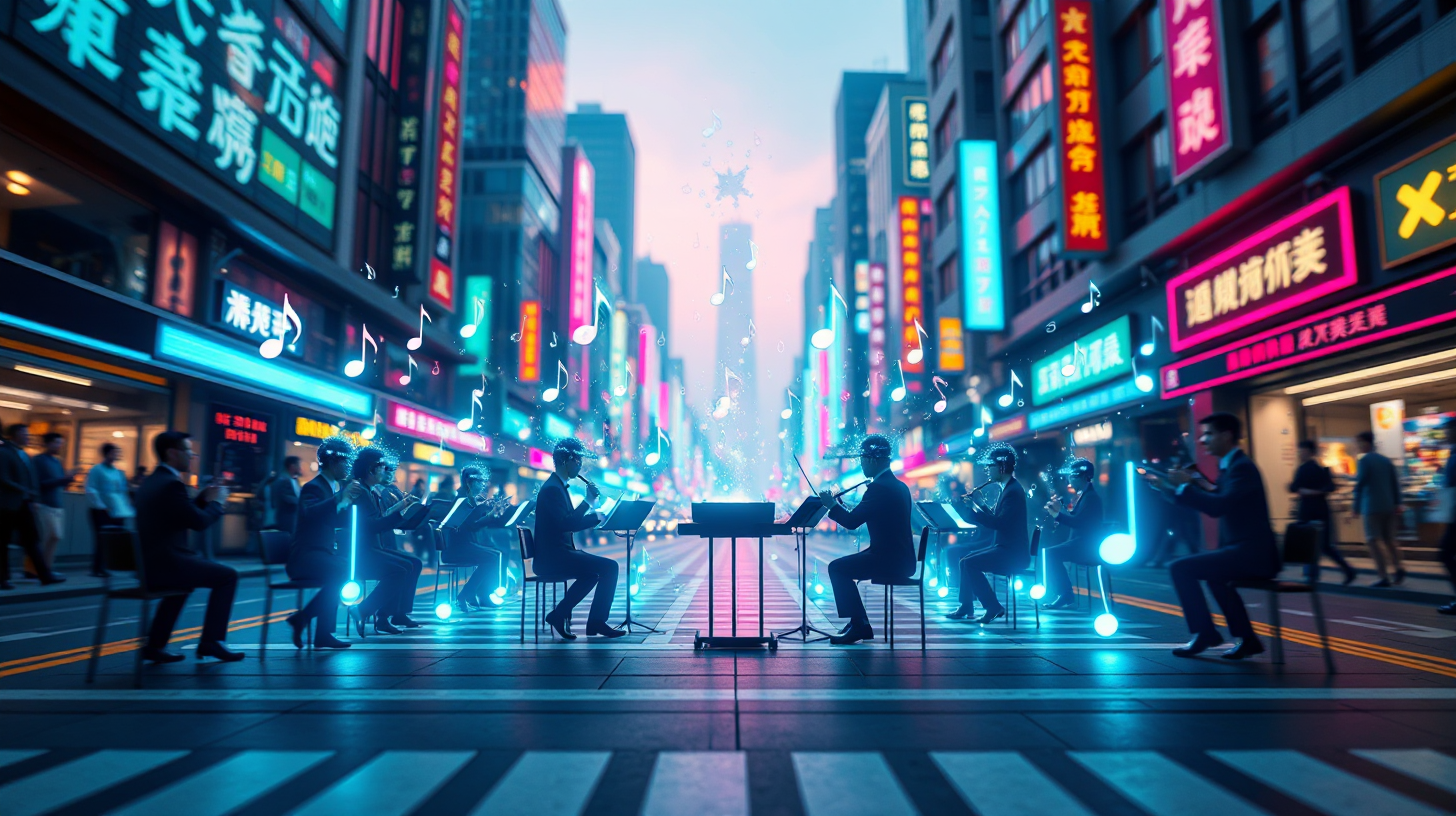 作图提示词:A mid-range shot of Futian Central District featuring holographic musicians conducting floating data notes that pulse with subway rhythms, forming a city emotion map. Eye-level perspective with tracking motion blur on notes, mixing neon and ambient lighting. Shot with a 35mm lens at f/2.8 for shallow depth of field, emphasizing note synchronization while keeping urban backdrop softly blurred. Color grading emphasizes cyan and magenta tones in shadows.