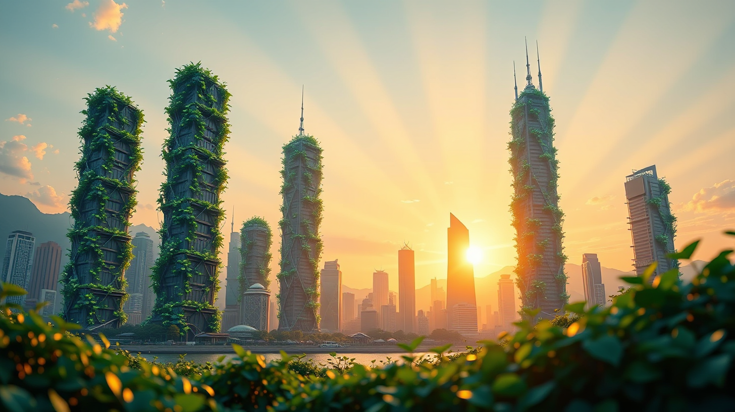 作图提示词:A futuristic skyline of Shenzhen Bay at dawn, with ultra-high-rise buildings covered in glowing quantum vines that adjust their photovoltaic leaves to sunlight, creating dynamic light and shadow interplay. Shot from a low angle to emphasize towering structures and intricate vine networks, using a vibrant color palette of gold, green, and blue to capture morning energy. Cinematic lighting with volumetric rays, depth of field focusing on foreground vines, and ultra-HDR details.