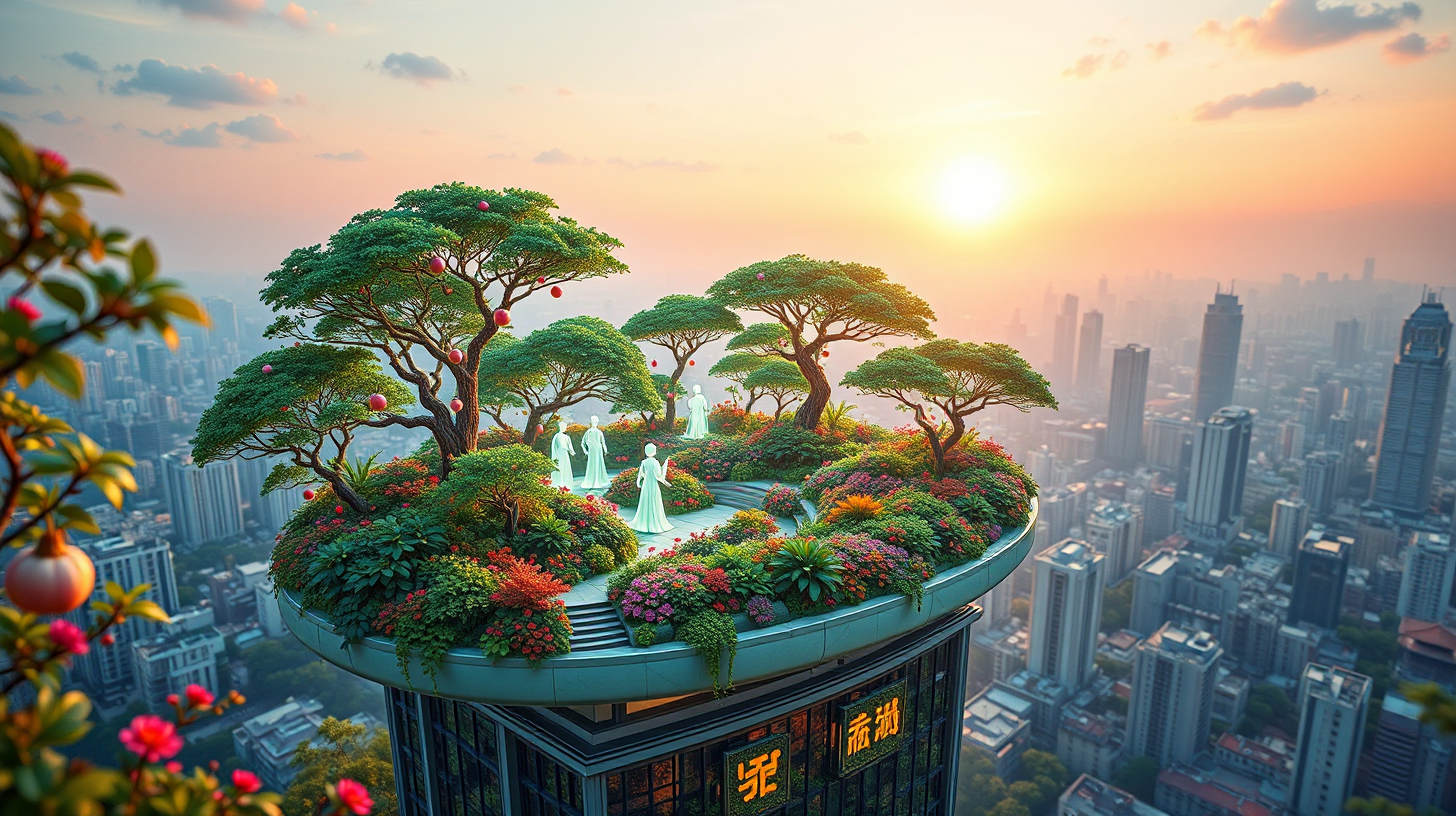 作图提示词:An awe-inspiring suspended garden atop the Ping An Finance Centre in 22nd century Shenzhen, where photonic lychee trees with quantum-entangled foliage intertwine with genetically-enhanced traditional plants, forming an immersive celebration. Dynamic holographic projections of Lingnan cultural elements—spectral Cantonese opera performers and electro-luminescent lion dance motifs—respond to environmental data streams. Captured from an elevated aerial perspective at magic hour using tilt-shift technique. Composition balances futuristic skyline with traditional garden elements in jade green, vermilion red, and imperial gold. Lighting combines plasma-based artificial sunlight with data stream radiance, rendered in ultra-high definition with cinematic depth of field.