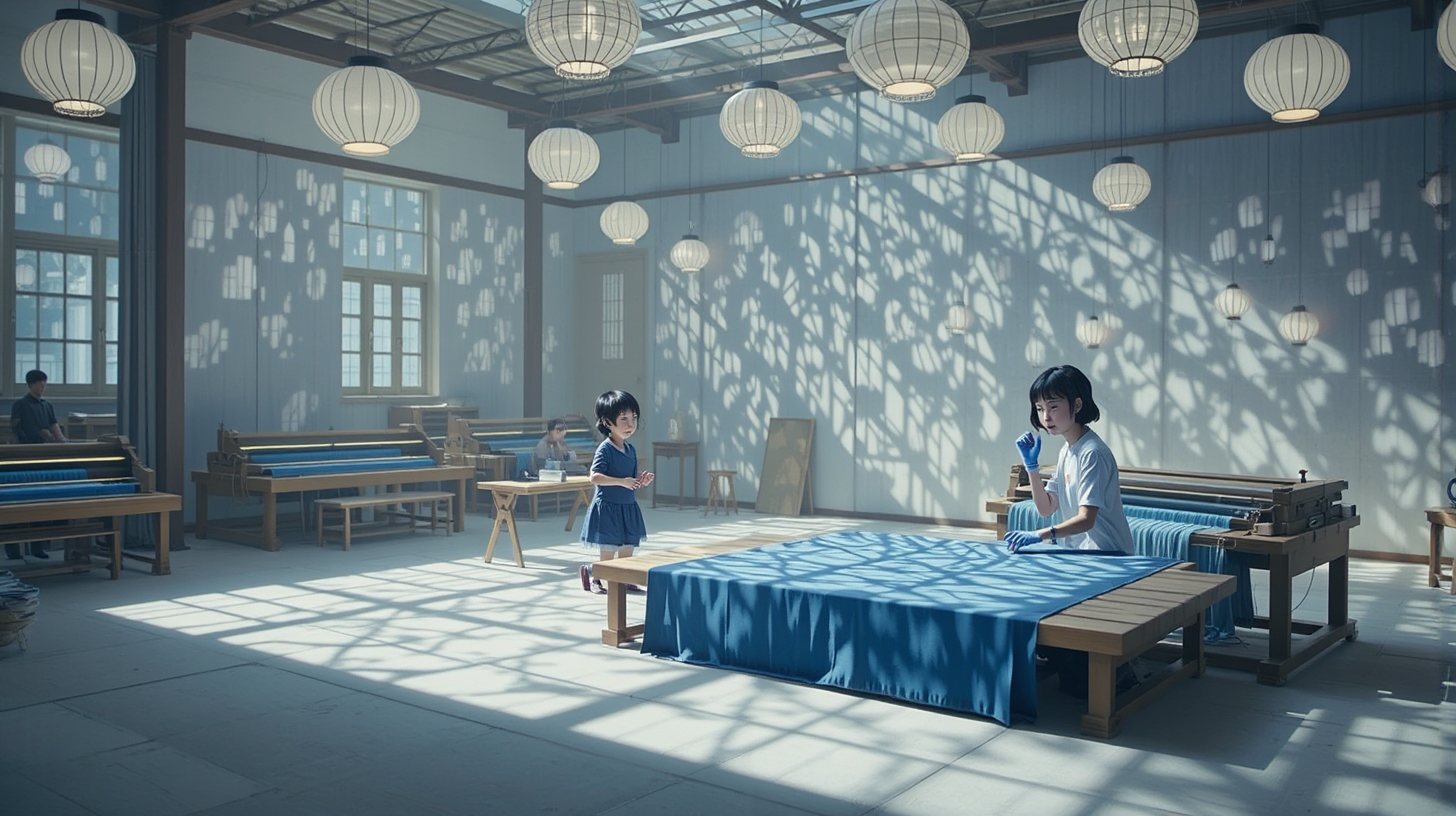作图提示词:A traditional indigo dyeing workshop in Nantong, China, reimagined with futuristic elements. Young designers wearing tactile feedback gloves interact with programmable fabric through brain-computer interfaces, creating dynamic patterns that shift with emotional input, glowing with bioluminescent hues. Soft daylight filters through modern, energy-efficient paper lanterns, casting intricate shadows on walls embedded with nano-displays. The scene harmoniously blends textile traditions with quantum technology, featuring advanced looms that integrate seamlessly with the futuristic setting.