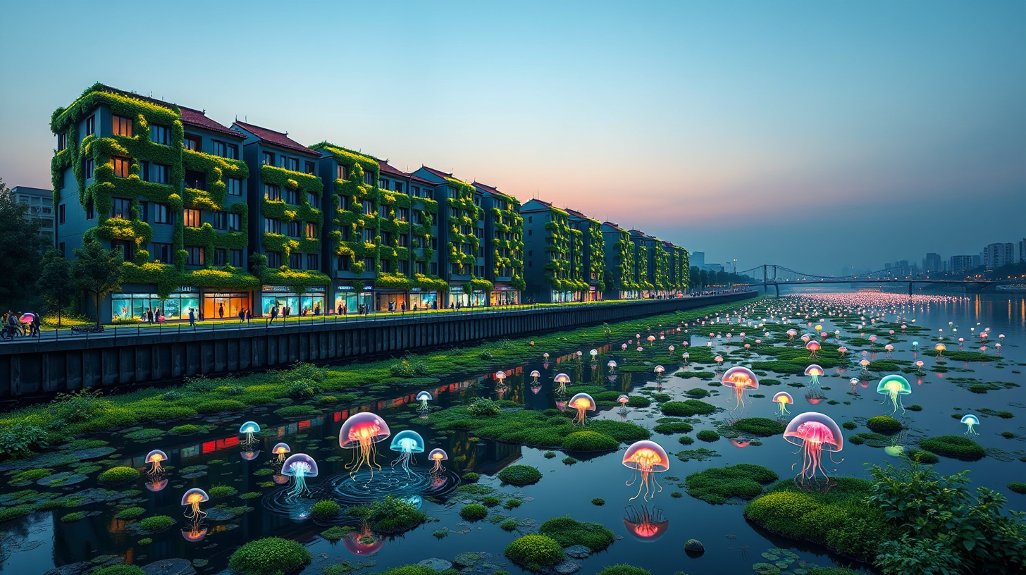 作图提示词:Buildings along the moat in Nantong, China, covered with bio-moss displays that form breathing light patterns spanning miles, based on water quality monitoring data. Micro-robots moving in the riverbed, transforming pollutants into glowing jellyfish sculptures. Side view along the riverbank, showcasing the bio-moss displays and micro-robots, vibrant colors, serene mood, medium shot, twilight lighting, reflective water surfaces.