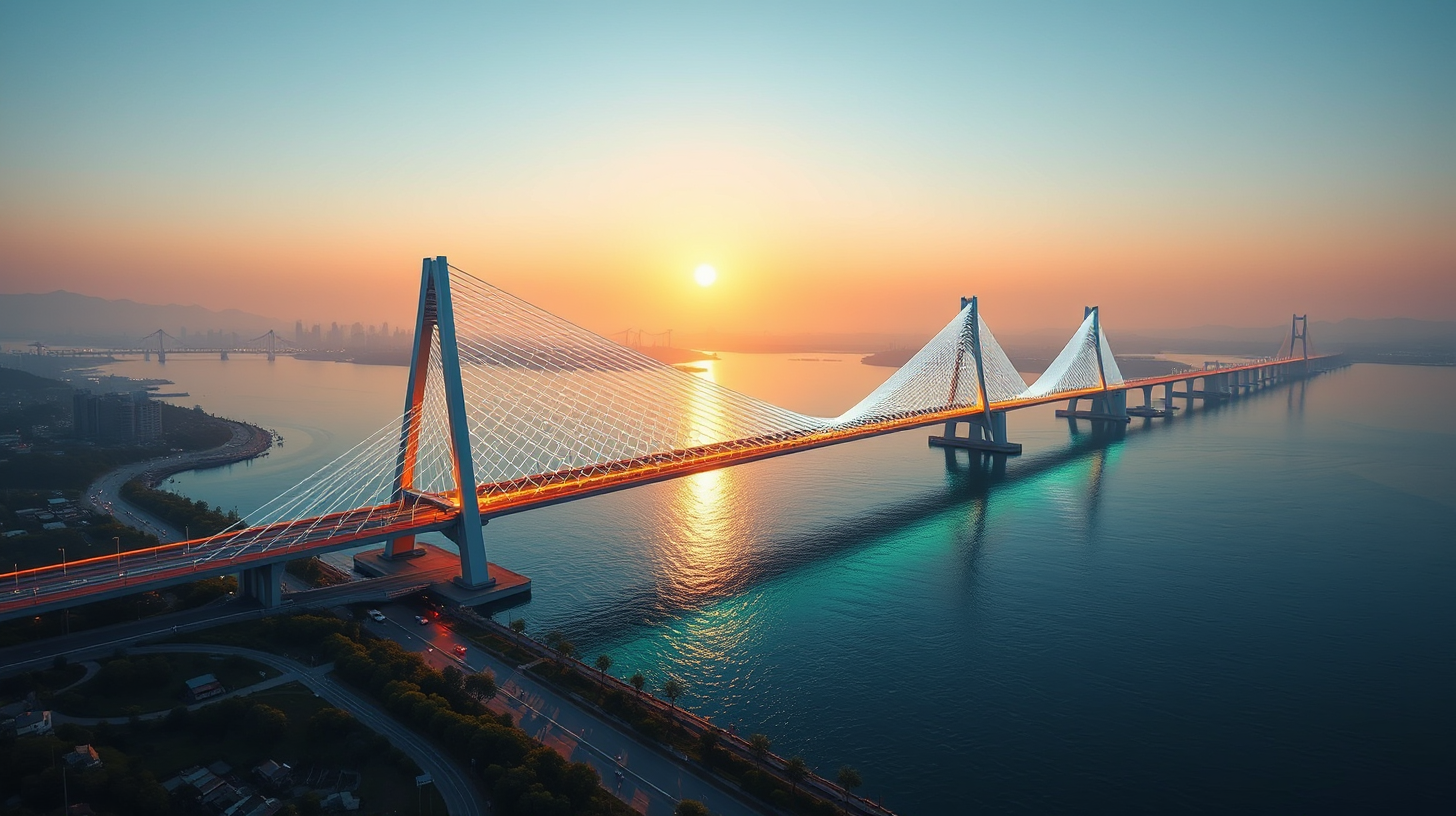 作图提示词:A futuristic dynamic bridge woven by quantum light beams at the Yangtze River estuary in Nantong, China, glowing in the morning sunlight, with its topology transforming rhythmically with the tides. Nano-repair robots at the bridge piers convert salinity gradients into urban energy. Aerial side view capturing the magnificent scene of the quantum light bridge meeting the river and sea, vibrant colors, energetic mood, ultra-wide shot, cinematic lighting, 4K resolution.