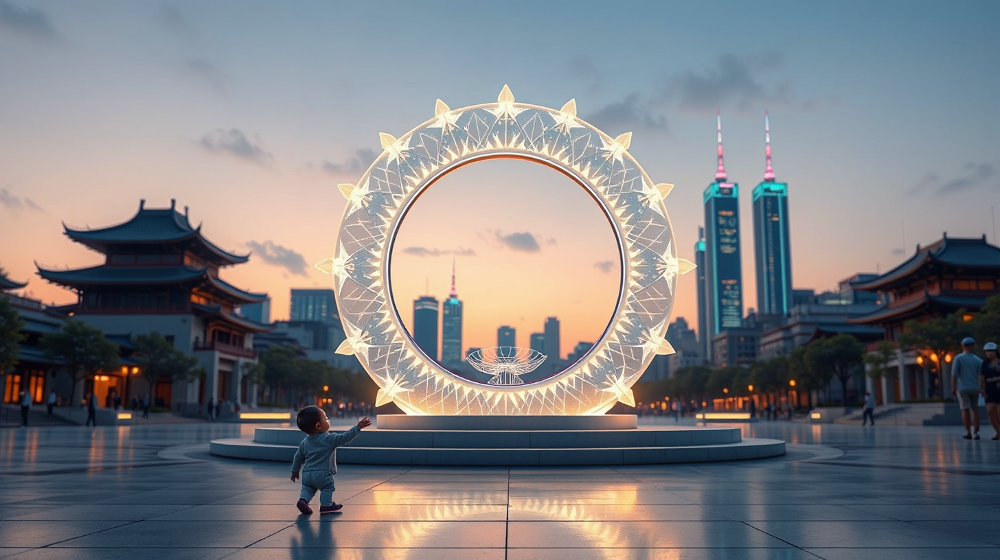 作图提示词:Nantong central square at twilight, featuring a colossal holographic starburst monument that pulses with the vocal patterns of local nursery rhymes and fishing songs. A newborn’s tiny hand interacts with the quantum stele, sending ripples of light through the floating ring, symbolizing the integration of personal memory into the collective consciousness. The monument’s nano-crystalline surface reflects a skyline where traditional Jianghai architecture merges with bioluminescent towers, illuminated by the soft glow of sustainable urban lighting. The scene captures a moment of technological and cultural harmony, with a cinematic depth of field emphasizing the monument’s grandeur against the twilight sky.