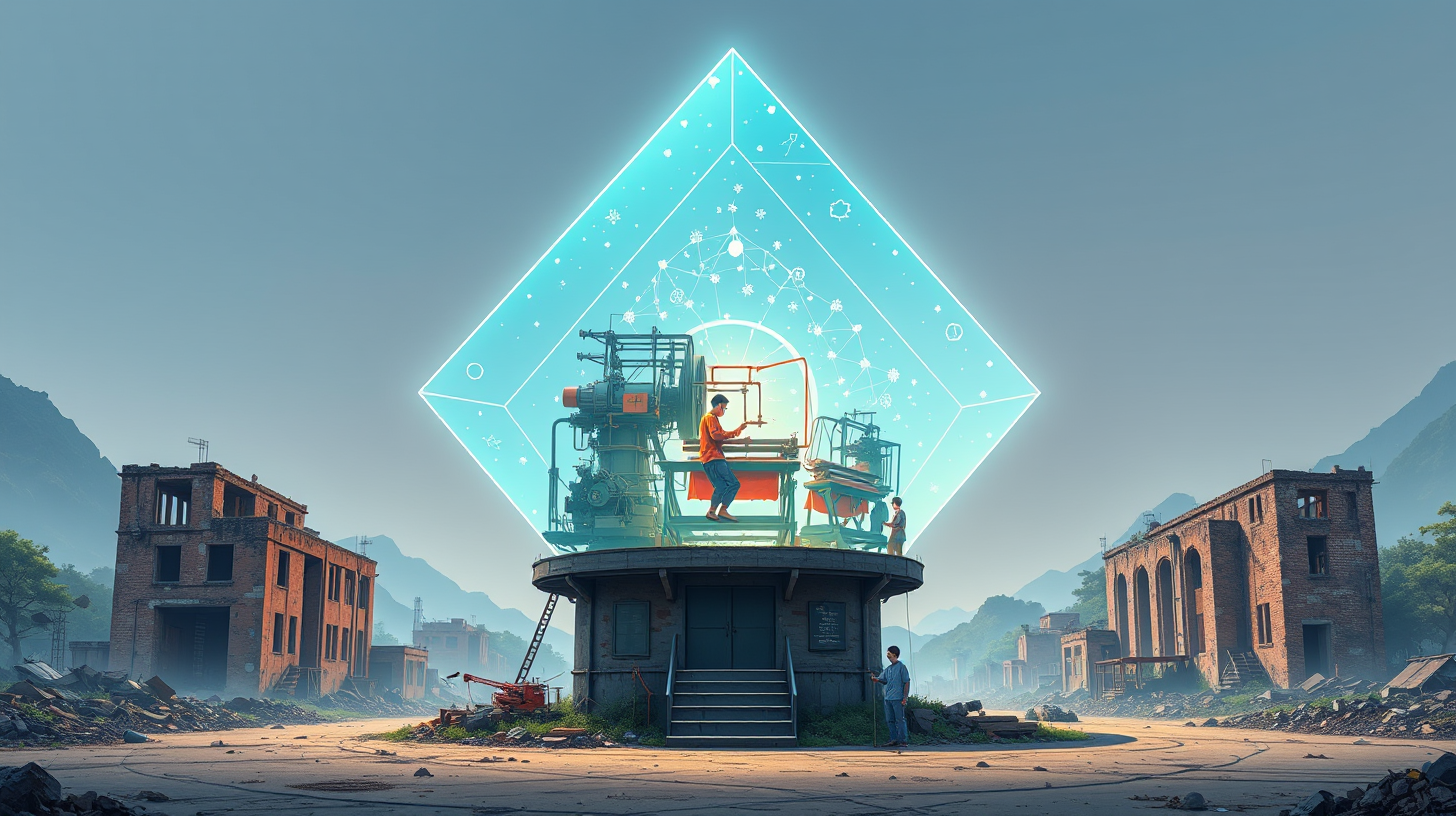 作图提示词:A diamond-shaped holographic projection pod hovering above the Zhangjian industrial ruins in Nantong, China, activated by the gestures of modern textile workers. Historic textile machinery and quantum looms perform a cross-temporal collaboration within the holographic light. Front view focusing on the projection pod, showcasing the fusion of historical and modern textile technology, vibrant colors, energetic mood, medium shot, soft diffused lighting, high detail.