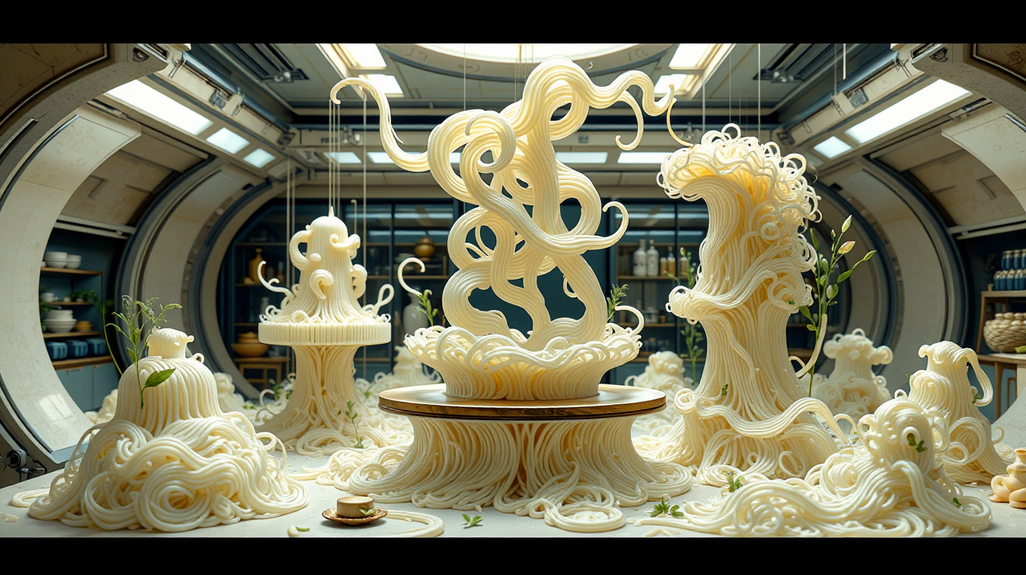 作图提示词:An intricate close-up of a modular culinary lab where heritage rice noodle techniques merge with molecular gastronomy. Milky rice paste levitates in anti-gravity chambers, guided by precision magnetic fields to self-assemble into intricate edible structures. The flowing organic shapes evolve in real-time, demonstrating how traditional Changde noodle craftsmanship has adapted to create sustainable food architecture. Crisp laboratory lighting highlights the translucent quality of the biopolymer material, with ultra-detailed textures showcasing both traditional fibrous noodle textures and futuristic construction methods.