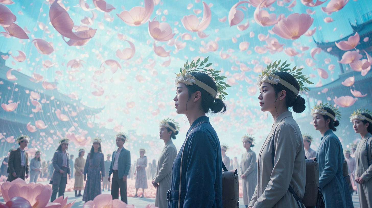 描述:春分时节的广场上,市民们佩戴着柳叶编成的神经接口头环,闭目凝神。头环散发着柔和的光晕,将众人的意识牵向云端,在那里,陶渊明笔下的桃花源正缓缓重构——落英缤纷的小径,鸡犬相闻的村落,都在量子花瓣的环绕中渐渐清晰。古老的亭台与全息光影交织,一场跨越维度的文化传承仪式,在寂静中完成了最深情的对话。
