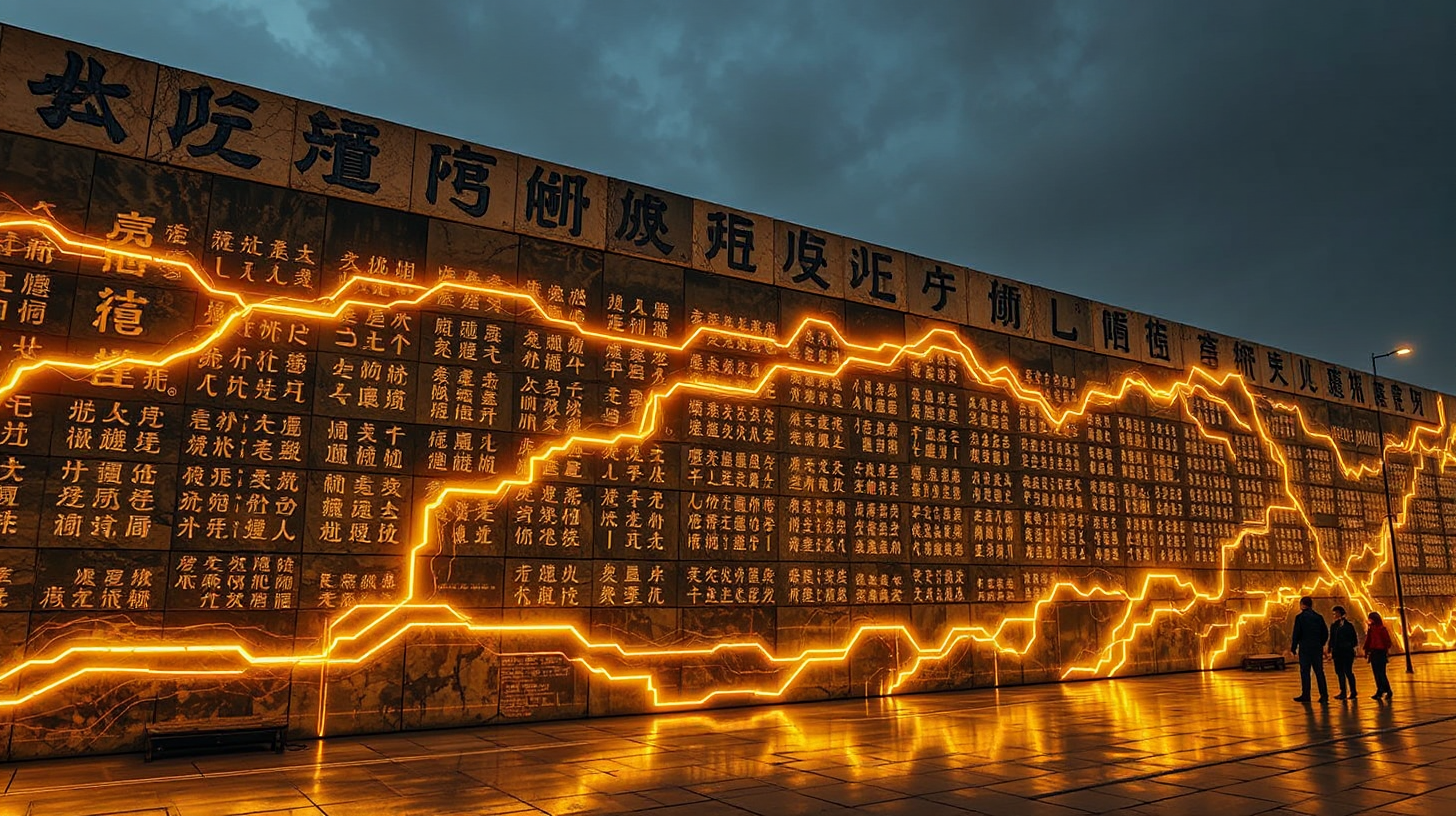 作图提示词:A dramatic side view of Changde’s three-kilometer flood control poetry wall reimagined as a city-scale neural interface, where engraved classical Chinese poems transform into pulsating streams of golden data. The luminous calligraphy flows across the ancient stone surface like liquid circuitry, forming synaptic connections between historical texts and real-time urban data. Cyberpunk lighting accentuates the contrast between the weathered granite and glowing information pathways, rendered with ultra-HD detail to showcase both the texture of traditional stone carving and cutting-edge holographic projection technology.