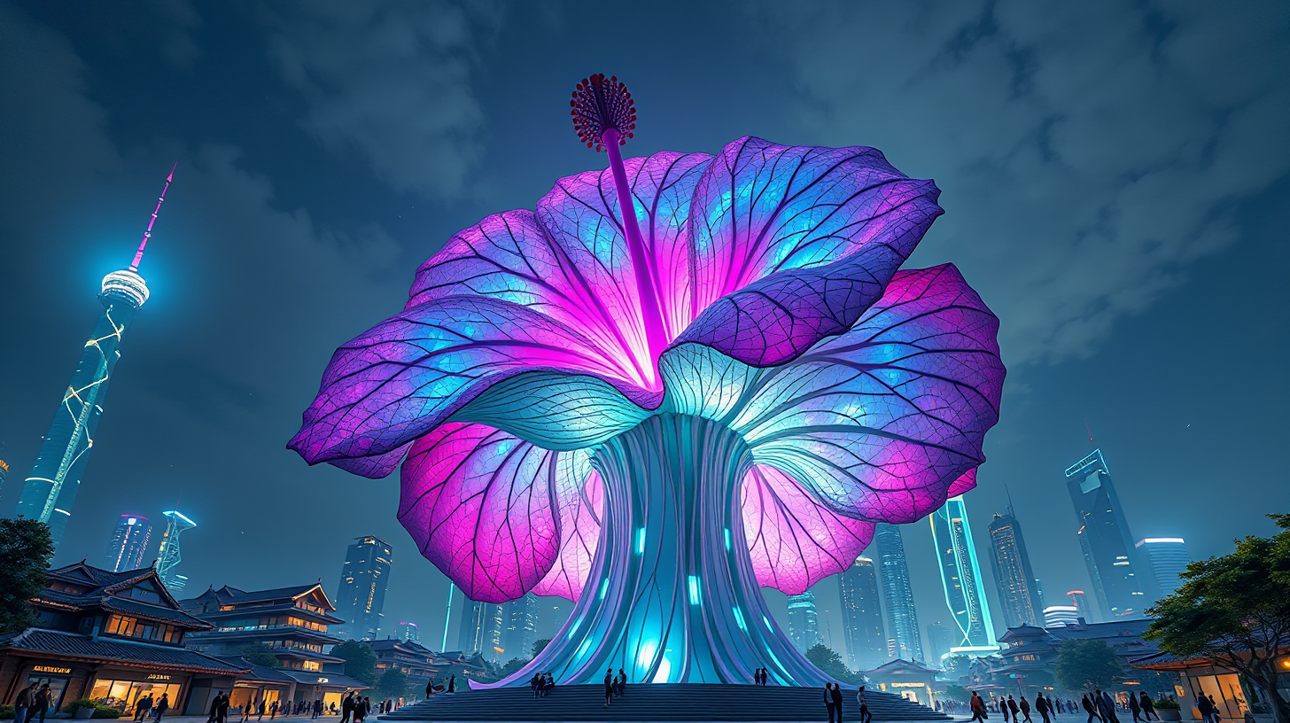 作图提示词:A towering hibiscus sculpture in the city square center, its massive petals displaying dynamic bioluminescent patterns that evolve in real-time according to residents’ DNA data streams. The monument stands against a futuristic cityscape where traditional Chinese rooftops merge with glowing data towers. Shot from a low angle looking upward to emphasize the sculpture’s grandeur, with the petals radiating vibrant pulses of magenta and cyan light that illuminate the surrounding area. The lighting creates dramatic shadows that interact with architectural features, creating an ever-changing play of light and form across the plaza.