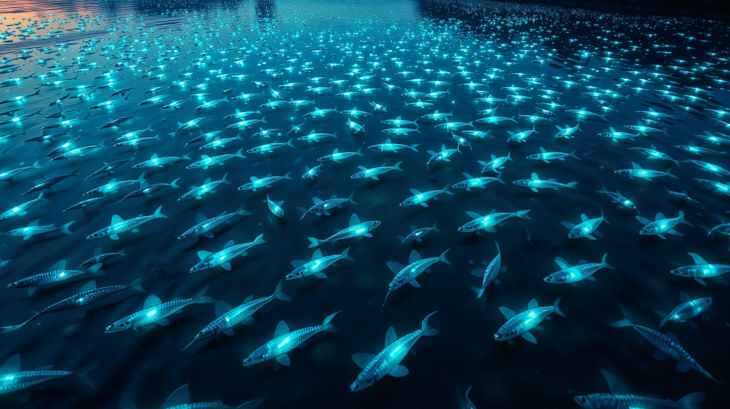 作图提示词:A mesmerizing twilight aerial view of Yuan River’s surface, where schools of endangered Chinese sturgeon swim synchronously with swarms of bioengineered monitoring drones. The firefly-like sensors pulse with gentle blue-green bioluminescence, forming dynamic patterns that mirror the fish’s movements while purifying the water. This symbiotic ecosystem creates an ethereal ballet of light and motion, captured with magical realism styling. Cinematic lighting enhances the contrast between the dark water, glowing drones, and the sturgeons’ silvery scales, rendered in ultra-HD detail to showcase this innovative 21st century conservation technology.