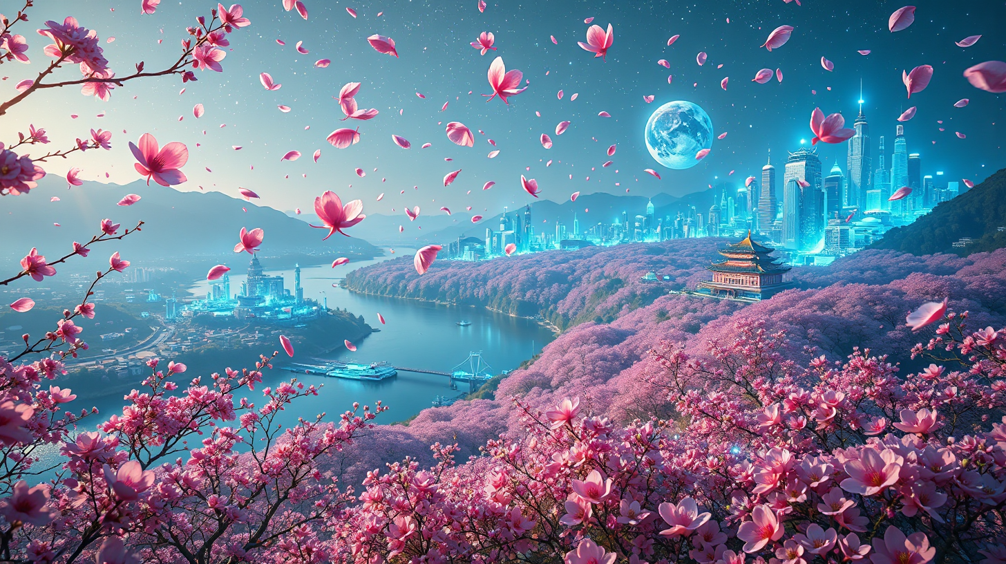 作图提示词:A breathtaking aerial view of the thousand-year peach blossom forest along the Yuan River in Changde, China, where quantum-state petals emit an ethereal bioluminescent glow. The flowers project multidimensional holograms of Peach Blossom Spring memories across spacetime, with floating petals forming dynamic archival displays that interweave ancient pastoral scenes with futuristic cityscapes. The scene features a surreal blend of vibrant pink blossoms and blue quantum energies under dramatic cinematic lighting, rendered with hyper-realistic detail and fantastical elements characteristic of 22nd century eco-technology.