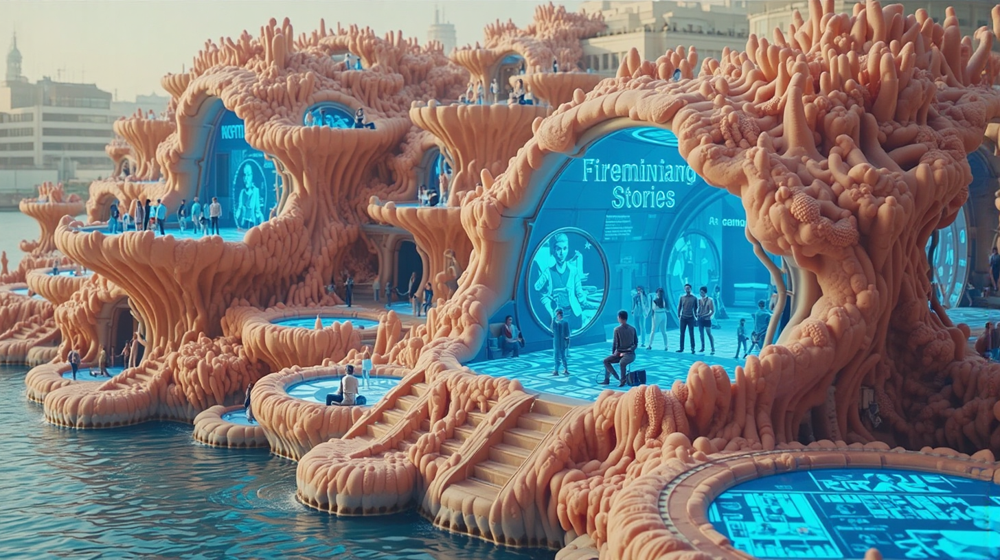 作图提示词:Coral-like architectural complex by Red Bay, with bioluminescent concrete surfaces displaying holographic projections of fishermen’s stories, medium shot showing intricate details of the living architecture during morning data synchronization, warm coral tones with blue holographic accents, peaceful yet informative atmosphere. The architecture embodies the fusion of organic forms and smart technology in contemporary coastal cities.