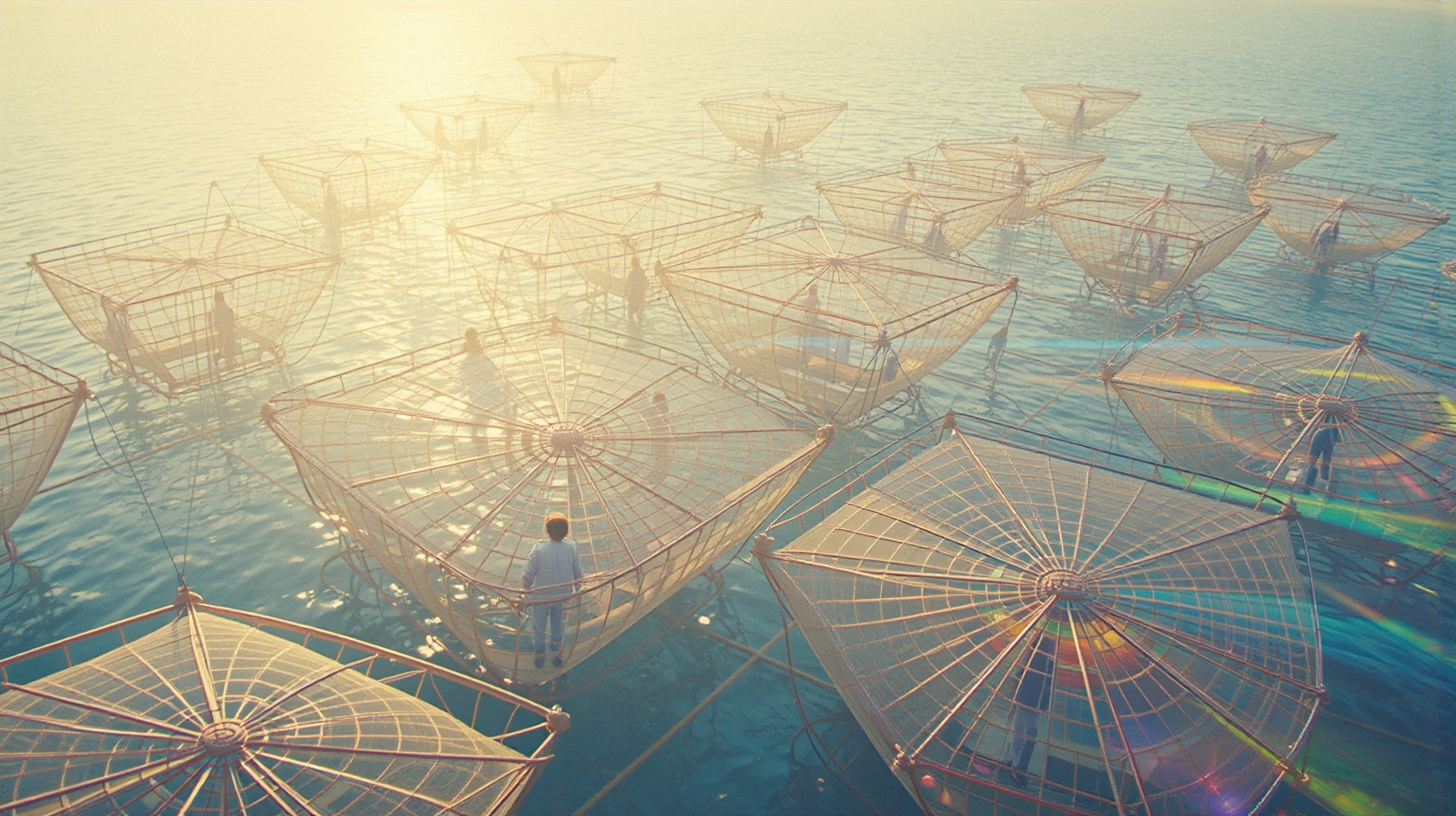 描述:汕尾的晨曦像打翻的金箔,泼洒在平静的海面上。半透明的量子渔网在浪尖轻轻起伏,可编程光子纤维织就的网面,正随着鱼群游动的生物电脉冲,悄然调整着网格的疏密。朝阳穿透网眼,折射出的彩虹光谱在波光中流转,如同给海面系上了一条流动的七彩丝带。远处的传统渔船剪影静静停泊,千年渔业的智慧与科技的微光在此交汇,海浪拍打船舷的声响里,藏着新旧时代的和鸣。