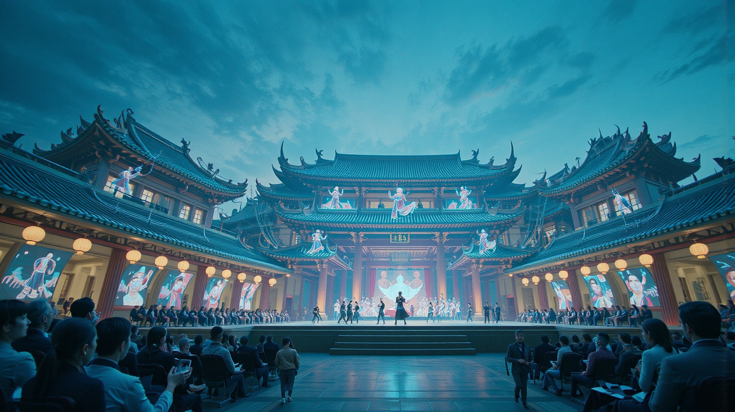 作图提示词:A quantum-enhanced temple stage in futuristic Shanwei, China, with holographic projections of traditional opera performers dancing across the neo-futuristic architectural facades, bioluminescent data streams shimmering from audience interfaces, vibrant cultural motifs merging with quantum display technology. Ultra-wide angle composition showing the seamless fusion of tradition and innovation, with atmospheric neon-tinged lighting against twilight sky, creating a mystical yet technologically advanced mood. Shot with a 16mm lens to emphasize the grand scale, using dynamic lighting with cool blue quantum accents contrasting warm traditional lanterns, shallow depth of field focusing on the central holographic performer.