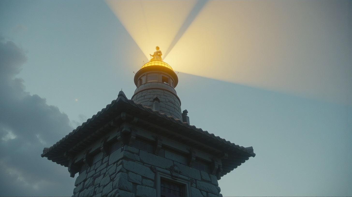 作图提示词:Traditional stone-carved smart lighthouse with neural-network powered Mazu hologram hovering at its peak, low-angle shot emphasizing the holographic deity projecting safe navigation routes with her beam compass, majestic golden light against twilight sky, reverent and protective atmosphere. This modern interpretation of traditional maritime protection combines ancient beliefs with AI technology.
