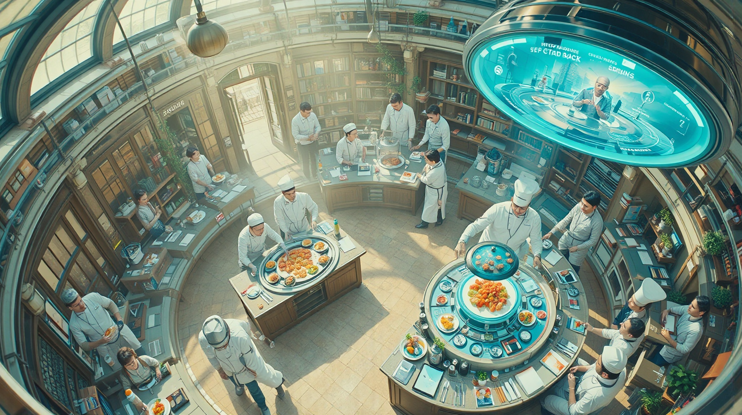 作图提示词:Spherical high-tech kitchen in old town center, chefs wearing tactile gloves manipulating holographic cooking stations, overhead view focusing on quantum preservation pods delivering fresh seafood while AI recommends personalized recipes, vibrant culinary colors with futuristic interfaces, energetic and innovative atmosphere. The scene showcases how traditional culinary arts merge with quantum food technology in future gastronomy.