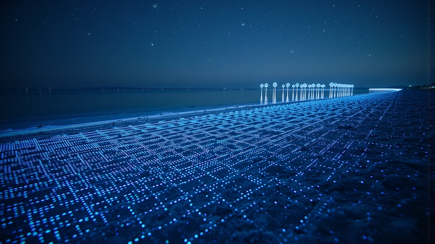 描述:夜幕为汕尾的海岸披上深蓝色的纱衣,沙滩上的生物荧光沙粒却开始苏醒。孩子们嬉笑奔跑,脚下便绽放出紫罗兰色的光花;情侣轻声细语,身边的沙粒便泛起温柔的粉晕——它们正随着人们的情绪变幻色彩。海面之上,无数微型浮标组成的光网缓缓升起,将海浪的低语、鱼虾的游动都转化为流动的光带,与沙滩的荧光呼应成歌。这是海洋与人类最温柔的对话,科技让无声的情感有了璀璨的模样,夜未央,这份共鸣仍在继续。
