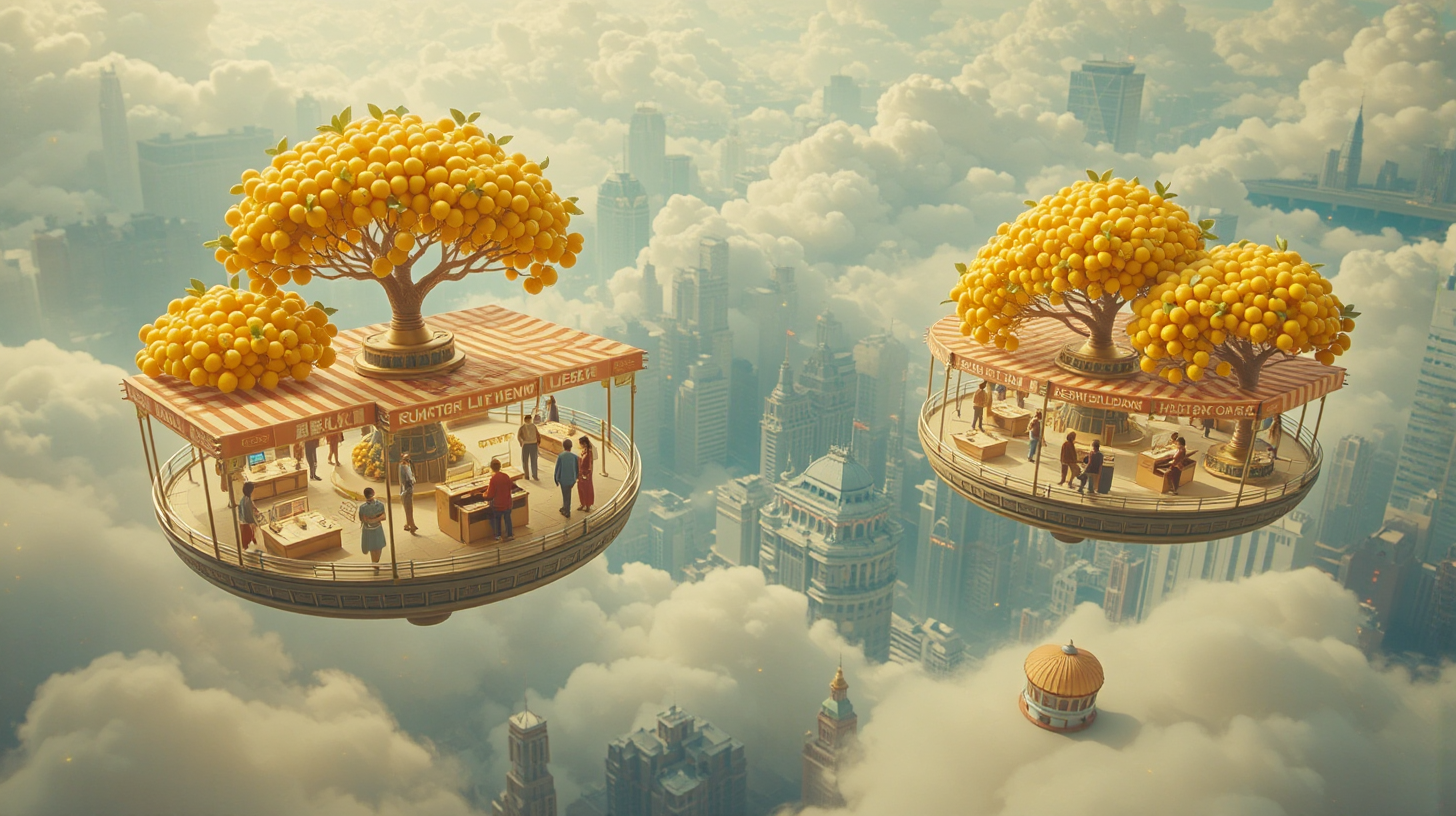 作图提示词:Anti-gravity flower market floating in clouds at kilometer altitude, with stalls selling electronic kumquat trees that emit holographic blessings. Citizens browse the market via photon rail cars, as the singing fruits project customized festive messages. Wide aerial view showing the contrast between the futuristic market and traditional cityscape below. Warm golden and red color scheme with ethereal cloud effects, combining Lunar New Year tradition with sci-fi elements.