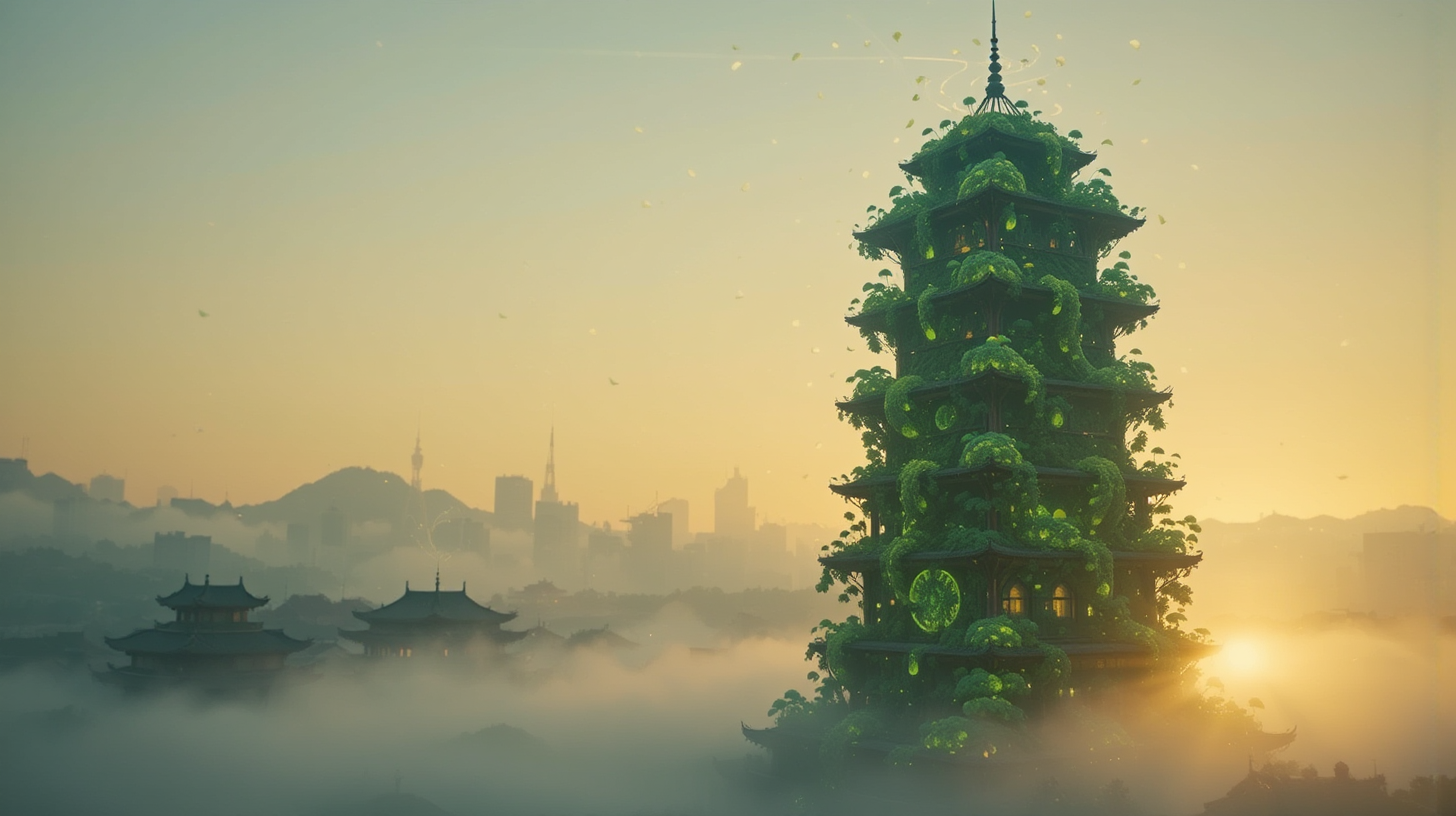 作图提示词:A futuristic Canton Tower at dawn, its apex covered in glowing quantum moss matrix releasing fluorescent spores into the morning mist. The spores form ethereal light ribbons intertwining with holographic tea aroma molecules rising from traditional teahouses below. Ultra-wide shot from low angle showing the entire tower silhouette against golden sunrise, with intricate details of bioluminescent moss patterns. Cinematic lighting with volumetric fog, color palette of emerald greens and amber golds, creating a serene yet technologically advanced atmosphere.