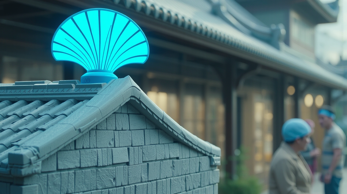 作图提示词:Traditional Xiguan arcade buildings with transformed roof ornaments, the characteristic ‘wok ear’ gables unfolding into neural interface stations. The antenna-shaped ornaments glow with soft blue light, receiving invisible brainwave signals from visitors wearing Lingnan paper-cut style headbands. Medium shot from side angle focusing on the transforming architectural details, with traditional arcade blurred in background. Color scheme of grey bricks with cyan accents, combining heritage aesthetics with cyberpunk elements.