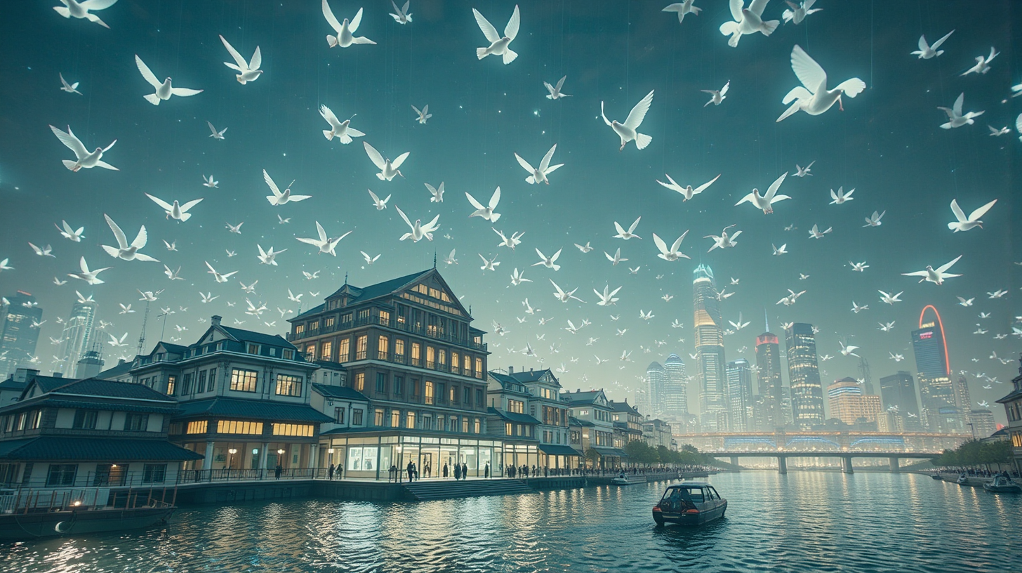 描述:午夜的沙面岛,月光淌在欧式建筑的穹顶。忽然,建筑展开纳米修复翼,如半透明的蝶翅泛着冷光,缓缓扇动。机械白鸽衔着光穗掠过,翅尖划开的光痕,竟是粤剧唱腔的曲线——时而婉转如流水,时而高亢如星火。修复翼与光痕在夜空交织,老建筑的砖石缝隙里渗出微光,像在慢慢抚平岁月的褶皱。珠江的倒影里,这场芭蕾如梦似幻,历史正借着科技,悄悄更新着自己的模样。