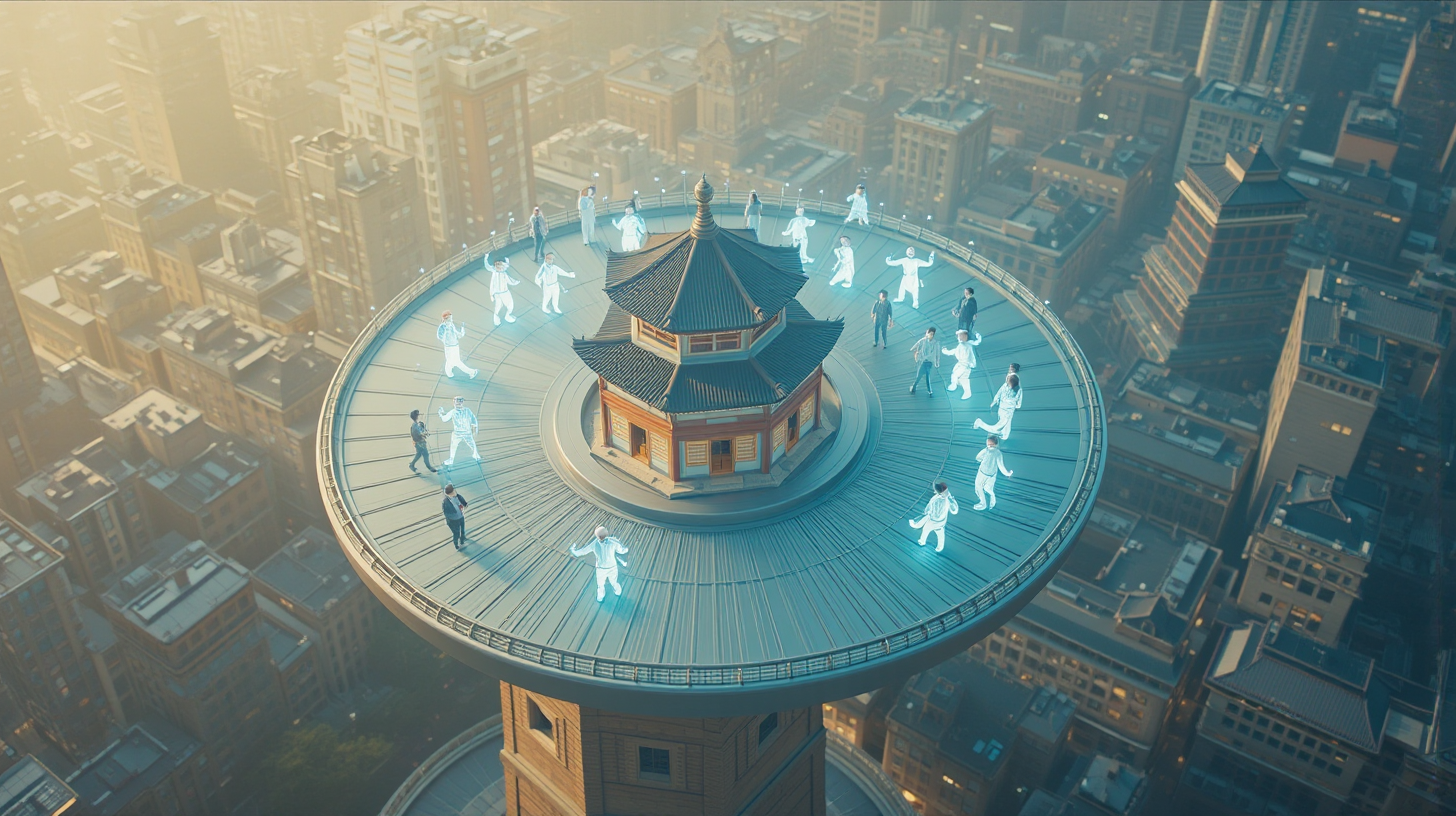 描述:六和塔顶的悬浮平台上,茶香袅袅中,市民围坐的茶桌中央,量子投影器正将众人的创意化作发光实体:有人构想的空中花园绽出绿芽,有人设计的智能公交幻化成流线型光体。脑波投票让最亮的构想升空,城市建造系统便在远处工地吐出原型。古塔的铜铃与投影器的嗡鸣和鸣,让千年的茶香里,飘着未来的形状。