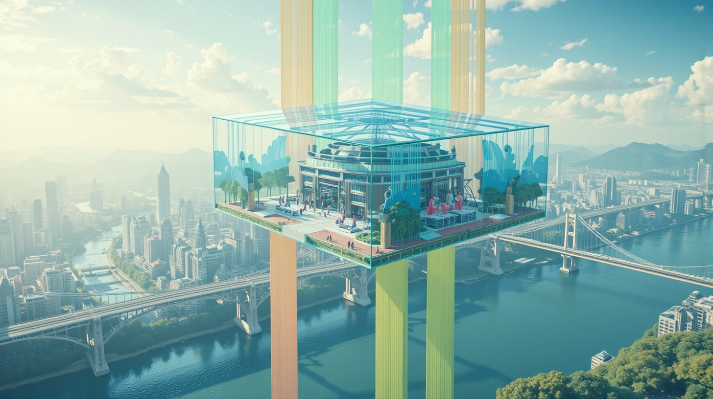 作图提示词:A mid-range upward shot of a transparent factory suspended above the Qiantang River, where intelligent spindles weave color-changing digital silk with molecular precision. Designers collaborate on a mind-cloud platform, transforming the landscapes of Hangzhou into real-time silk patterns. The scene is a stunning fusion of technology and art, with the transparent factory reflecting the river and sky. The lighting is bright and dynamic, highlighting the intricate details of the silk and the spindles. The colors are vibrant and ever-changing, mirroring the beauty of Hangzhou’s natural scenery.