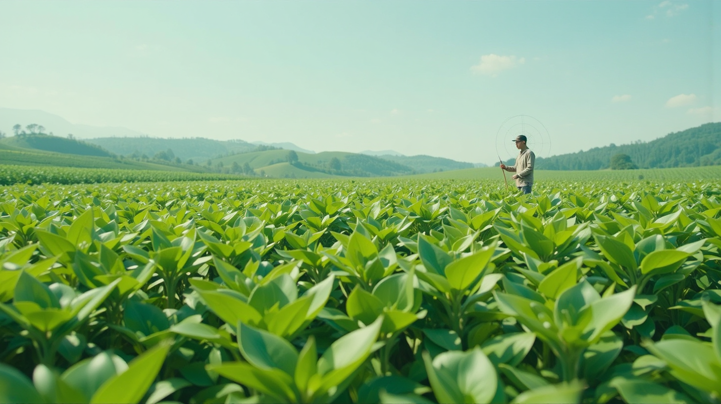 作图提示词:A serene mid-range shot of a transformed Longjing tea field, where each tea plant is embedded with a biological sensor neural network. Tea pickers wear mind-control gloves, using brainwave resonance to guide the precise growth of tea leaves. The scene is a harmonious blend of nature and technology, with lush green tea plants under a clear blue sky. The lighting is soft and natural, highlighting the intricate details of the sensors and the tea leaves. The colors are vibrant, with shades of green dominating the scene, creating a peaceful and futuristic agricultural landscape.
