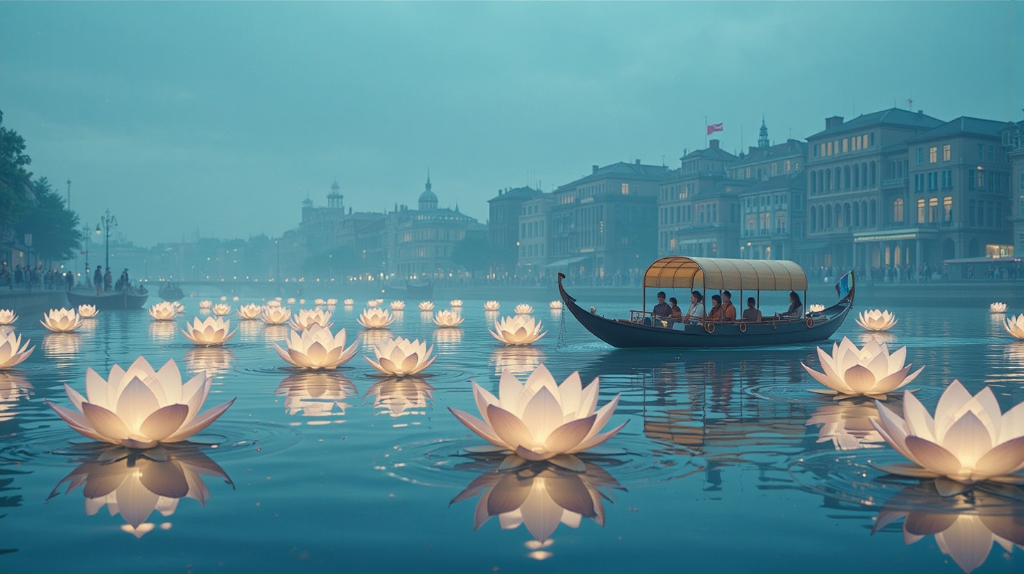 作图提示词:A wide-angle side view of the Grand Canal, with glowing data lotus leaves floating on the water surface, collecting life memories of residents along the shore. As a tourist boat passes by, the lotus leaves release stored images, forming a coherent holographic historical scroll on the river. The scene is a mesmerizing blend of past and present, with the reflections of the holograms shimmering on the water. The lighting is soft and ambient, with a mix of cool blues and warm oranges, creating a nostalgic yet futuristic atmosphere.
