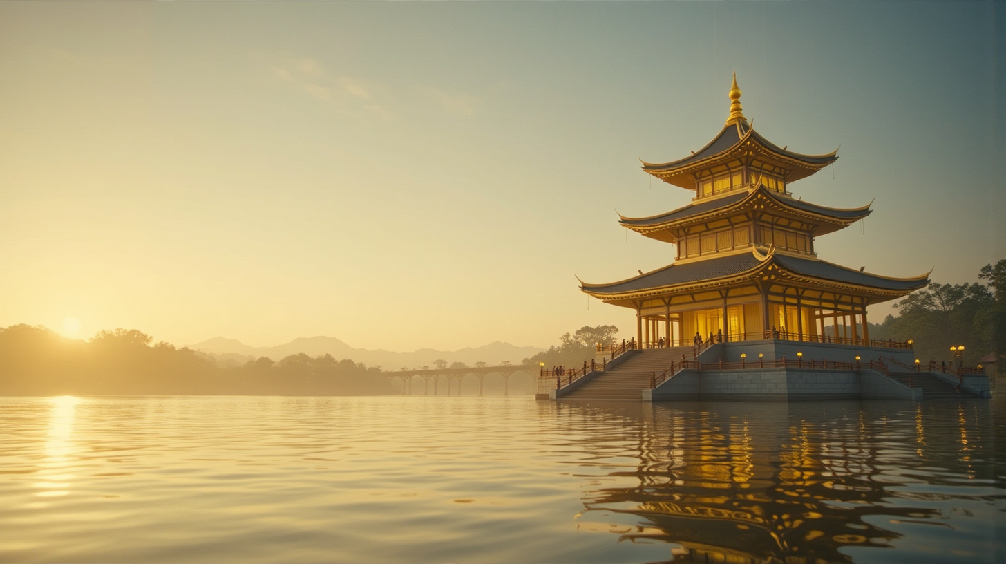作图提示词:A futuristic reinterpretation of Leifeng Pagoda in Hangzhou, China, where golden pulse lights illuminate its ancient structure at sunset. Advanced holographic interfaces float around the pagoda, blending seamlessly with traditional architectural details. The warm glow reflects on West Lake’s surface, creating dynamic light patterns. Ultra-wide angle composition with a shallow depth of field emphasizes the contrast between old and new. Shot with a cinematic 16:9 aspect ratio, using vibrant color grading with golden hour lighting to enhance the sacred atmosphere. Serene mood captured from a low-angle side view to showcase both the pagoda and its reflection.