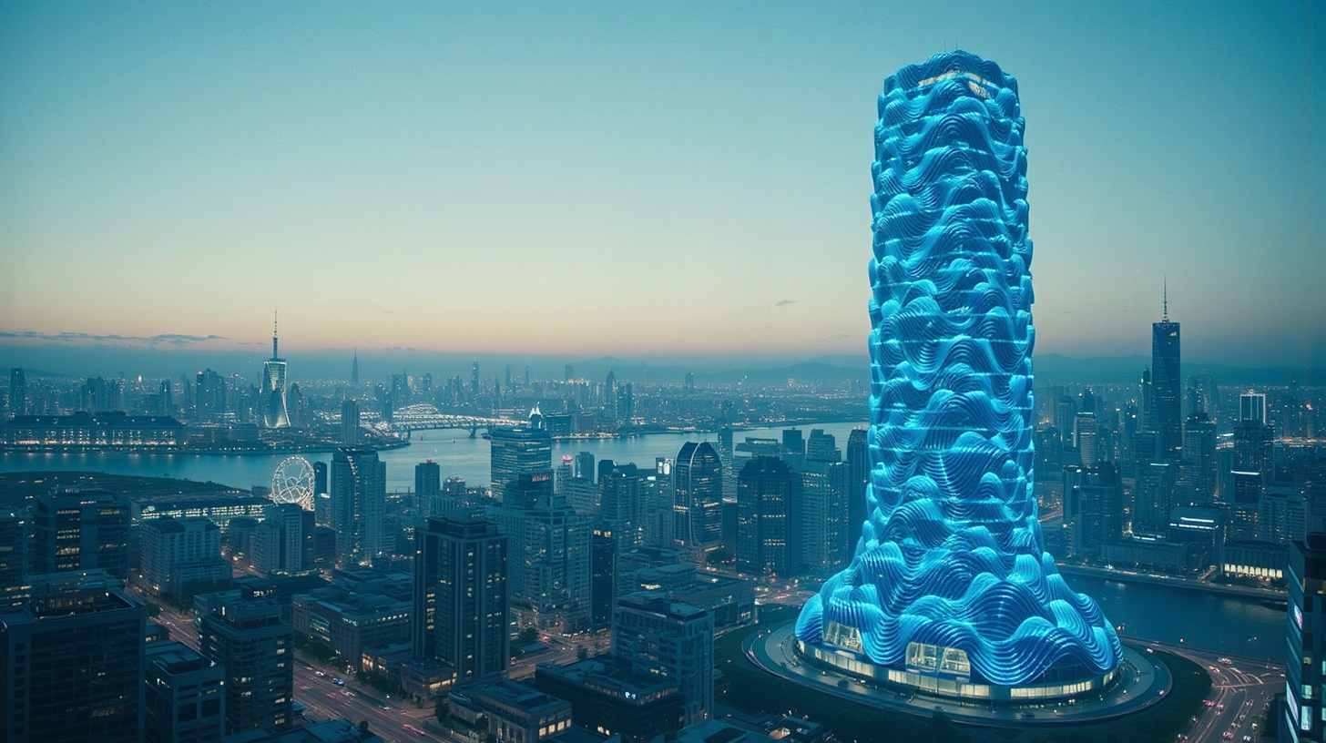 描述:暮色为日照市中心镀上薄纱时,光合之塔正苏醒。纳米硅藻涂层像吸饱了阳光的海绵,此刻正将能量化作蓝浪——先是塔基泛起细浪,转瞬便顺着流线型塔身攀援,浪峰在塔顶炸开又漫流而下,活脱脱把万平口的海浪搬上了摩天楼。光浪拍过之处,窗棂都成了波光,连晚风都带着蓝盈盈的暖意。
