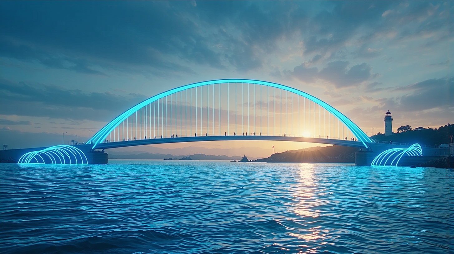 作图提示词:A futuristic arc bridge spanning the ocean between a lighthouse area and an island, constructed with programmable materials that emit soft blue glowing ripples with each footstep, creating wave-like light patterns radiating outward, the bridge’s elegant curve tracing a musical line across the sea surface, ambient spatial sound waves transformed from local fishing songs harmonizing with the light display, morning sunlight reflecting off the ocean, ultra-wide shot from a side angle showing the full length of the bridge against a sunrise sky, vibrant colors with glowing neon blue accents, energetic yet serene atmosphere of technological harmony with nature. The scene reflects a near-future setting where advanced materials and traditional culture coexist seamlessly.