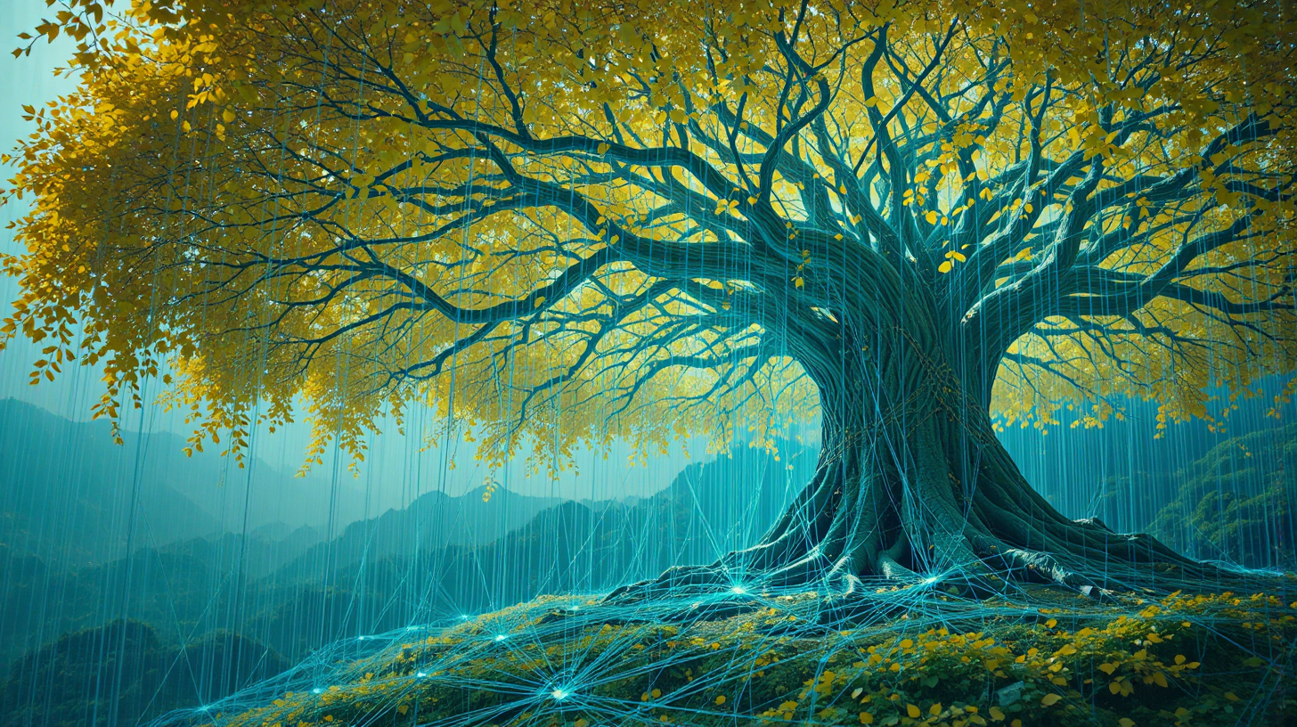 作图提示词:An ancient ginkgo tree on Fulai Mountain, its roots extending glowing bio-optical fiber networks into the ground, transmitting data pulses converted from Rizhao green tea fragrance, golden leaves interwoven with blue fiber lights, ultra-detailed natural-tech fusion, magical atmosphere, photorealistic style --ar 4:5 --v 6