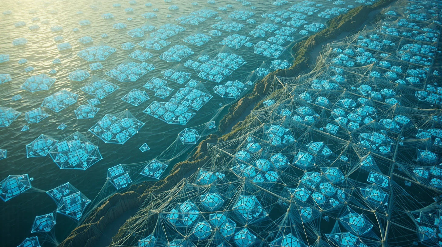 描述:晨光如融化的金子淌过日照海面,量子藻类正苏醒。这些微末的生命体像被无形的指挥棒牵引,从零散的光点聚成流动的网。蓝盈盈的光丝随浪摆荡,与初阳的金辉缠成锦缎,渔网图案在波峰浪谷间舒展、收缩,仿佛大海正在吞吐光芒,连礁石都被染上忽明忽暗的蓝,成了这幅光画的静默注脚。