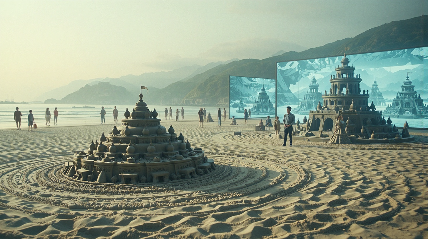 作图提示词:Rizhao beach with intelligent sand grains automatically forming dynamic sculptures, traditional sand art by day transforming into holographic projection screens at night, showcasing quantum reenactments of ancient black pottery culture, ultra-high detail, magical transformation moment, cinematic lighting, photorealistic style --ar 16:9 --v 6