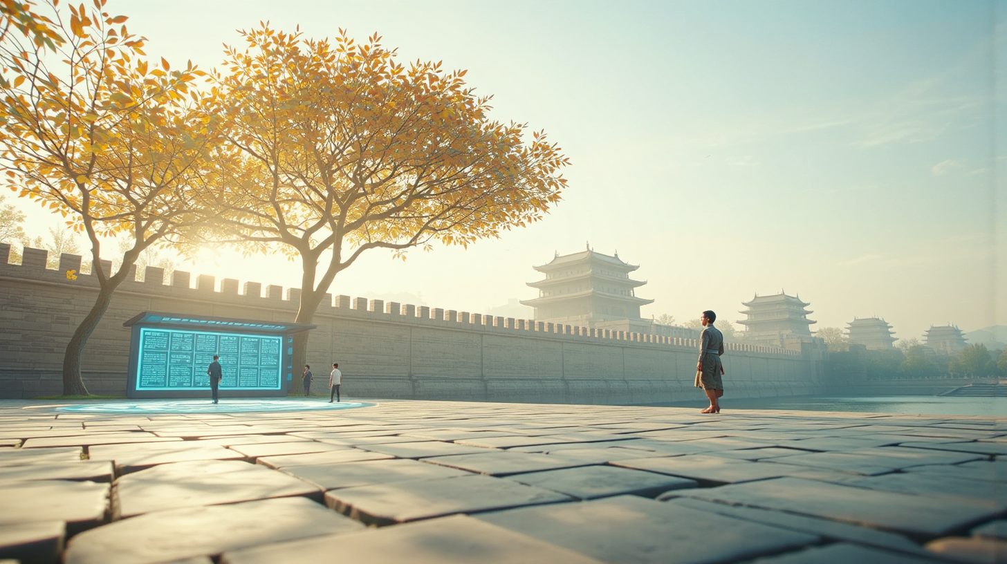 描述:南京古城墙的青砖在晨光中泛着暖金,墙根下的量子梧桐正舒展枝桠。纳米光膜制成的叶片像千万片小镜子,随着玄武湖传来的涟漪频率变幻色彩——从翡翠绿到琥珀黄,再到淡紫,仿佛把湖水的呼吸织成了光的绸缎。全息导游机器人静立一旁,明城墙的砖块成了它的幕布,六朝诗词的光影在砖缝间流淌,与叶片的微光交织成诗。