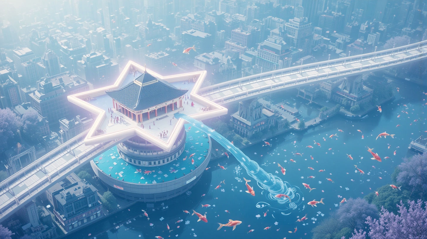 作图提示词:A star-shaped Wenshu light rail floats above the Confucius Temple in Nanjing, with ancient book data streams from Jiangnan Examination Hall flowing within it. By the quantum ink pool, creative texts transform into koi fish and swim into the Qinhuai River. The scene is captured with a panoramic view from a high angle, showcasing the intricate details of the light rail and the flowing data streams. The lighting is ethereal, with a mix of soft blues and purples, creating a dreamlike atmosphere. The mood is mystical and poetic, with a color palette of cool tones and glowing accents.