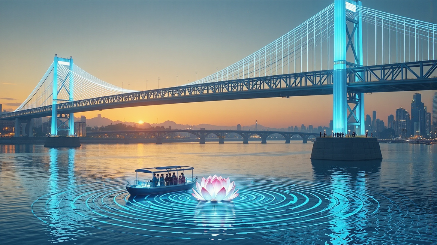 作图提示词:An aerial view of Nanjing Yangtze River Bridge at dusk, with its intelligent pylons emitting vibrant neural light streams that connect to buildings on both riverbanks, forming an energy network. A futuristic sightseeing vessel glides below, where children throw thought capsules into the water, creating ripples that blossom into luminous lotus flowers made of light. The flowers pulse with recorded city memories, their petals unfolding to reveal fragments of Nanjing’s history. The bridge’s steel structure glows with energy lines, contrasting with the warm sunset colors reflecting on the river surface. Traditional Chinese architectural elements blend seamlessly with the futuristic light technology, captured in a panoramic composition with long exposure to emphasize the light trails, using complementary color theory between the orange sunset and blue energy lights.