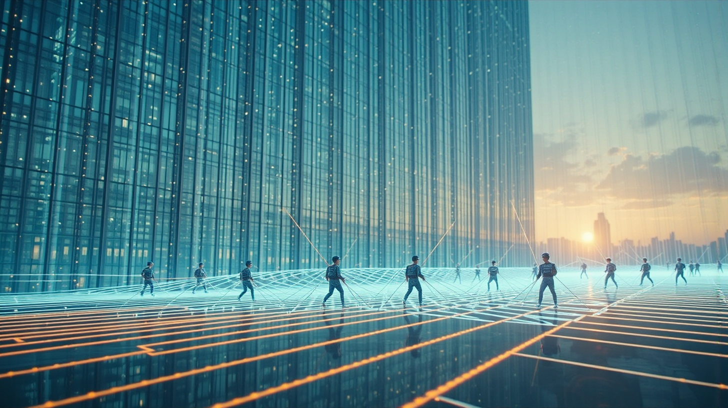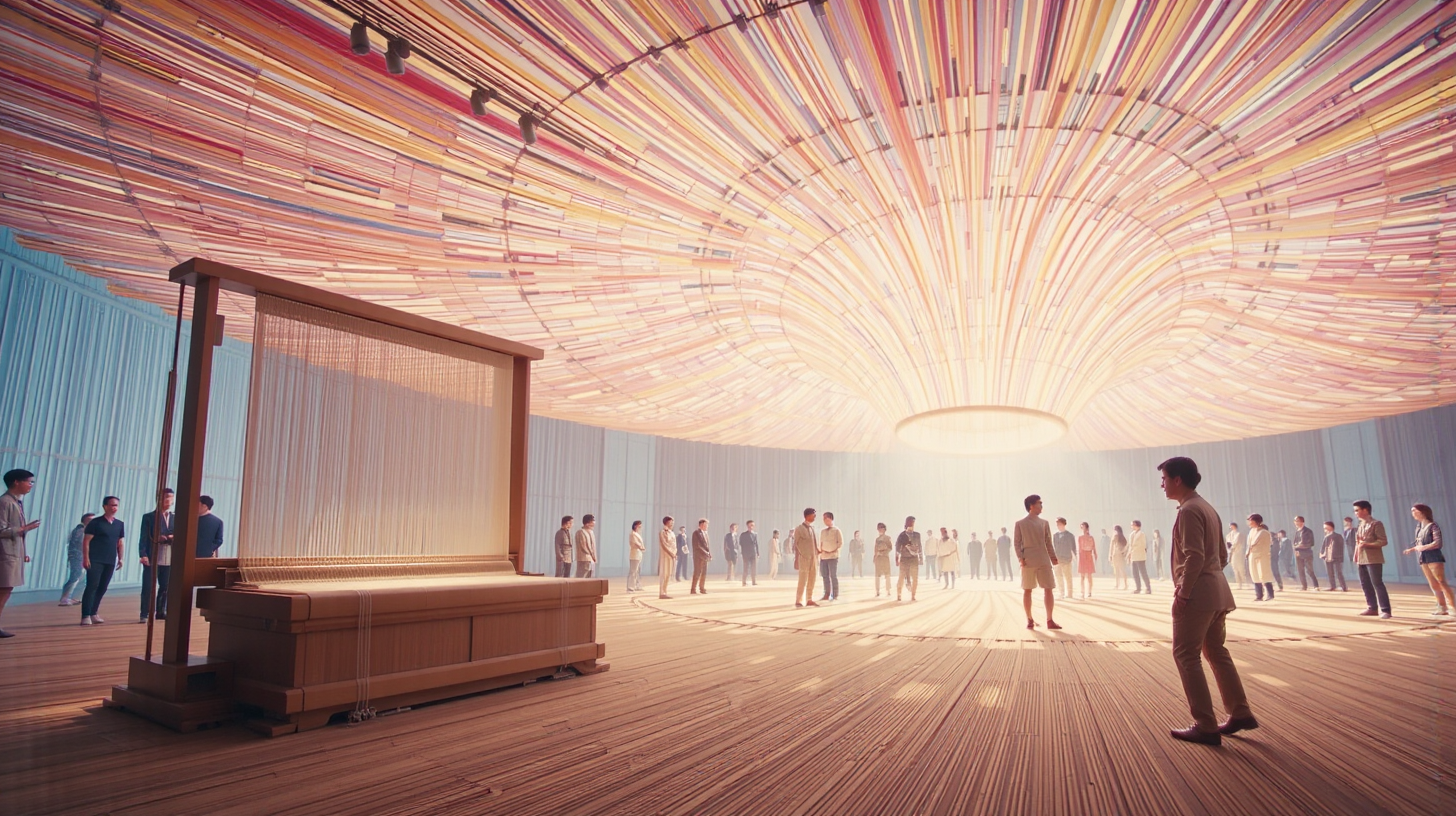 描述:云锦博物馆的穹顶下,智能织机的丝线在光影中穿梭,将游客的喜悦、惊叹与沉思织成流动的布料——孩童的雀跃化作绯红波纹,老者的凝视凝成靛蓝暗纹。当三位参观者同时将手掌按在传承终端上,古老的缠枝莲纹从织锦上跃起,与空中的数据流交织,刹那间绽放出璀璨的极光穹顶,那些流淌的光带里,还能瞥见明清织工弯腰织布的剪影。