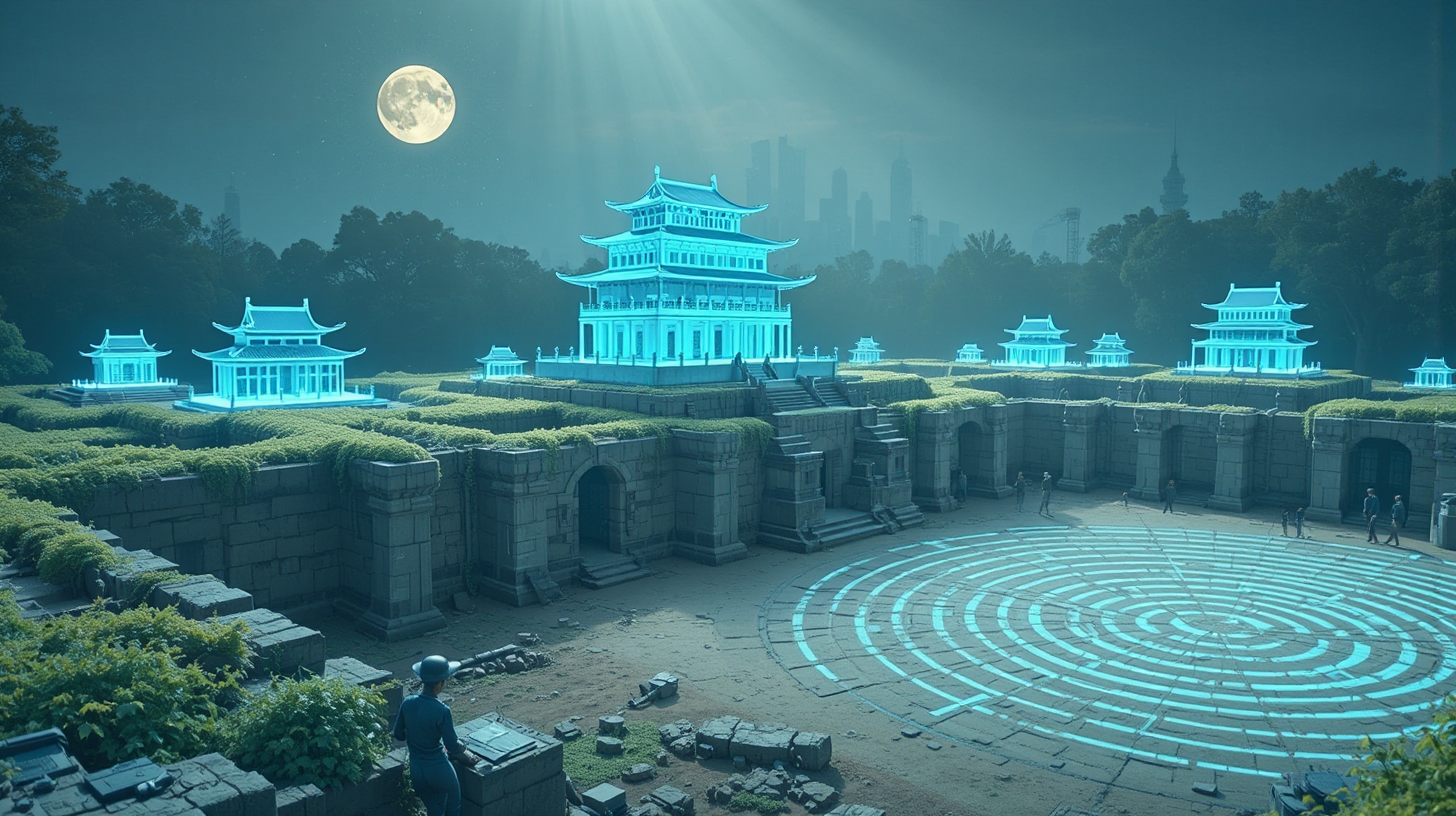 作图提示词:A futuristic archaeological site at Shitoucheng Park, Nanjing, where intricate gravitational wave patterns emerge from the ground under moonlight. Quantum moss covering ancient city walls glows softly, projecting holographic reconstructions of long-lost Six Dynasties palaces. The scene blends advanced technology with historical ruins, featuring autonomous quantum scanners analyzing the site. Moonlight casts ethereal blue hues across the stone surfaces, creating a mysterious atmosphere where past and future converge visually. The holographic palace structures appear translucent yet detailed, with traditional Chinese architectural elements floating above the ancient ruins, rendered in a cinematic wide-angle shot with dramatic chiaroscuro lighting emphasizing the contrast between ancient stone and quantum glow.