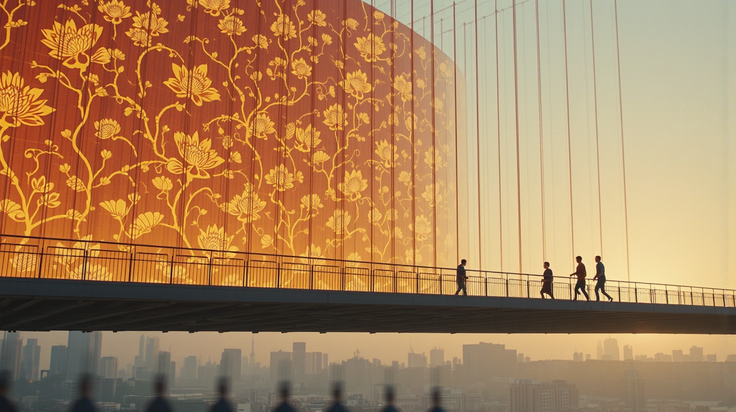 描述:新街口上空的云锦桥悬浮在楼宇之间,数百万纳米模块组成的桥面像活的锦缎,行人走过时便漾开或明或暗的纹路。夕阳把桥体染成金红渐变,两位陌生市民踏上同一块桥板的瞬间,桥面突然绽放出对称的金色缠枝莲——这智能纹样像无声的指引,让他们不约而同伸手,扶住了侧面闪烁着不稳光流的稳定器,莲纹在他们指尖相触时愈发鲜亮。