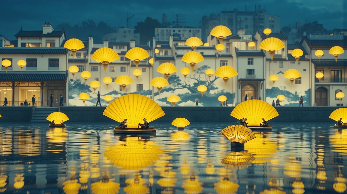 作图提示词:A breathtaking futuristic scene of the Qinhuai River in Nanjing, with clusters of intelligent lanterns floating above the water, their interiors revealing nano-scale folding fan robots at work. The river surface reflects a dynamic light painting composed of glowing handicrafts, casting a mesmerizing interplay of warm yellow lantern light and indigo blue water. The traditional white walls and black tiles of the riverside buildings serve as a canvas for the projected ink-wash animations. The scene is captured from a reflective water surface perspective, emphasizing the contrast between the warm and cool tones, with a shallow depth of field to highlight the lanterns and their reflections, using a color palette of warm yellows and cool blues to enhance the futuristic yet traditional ambiance.