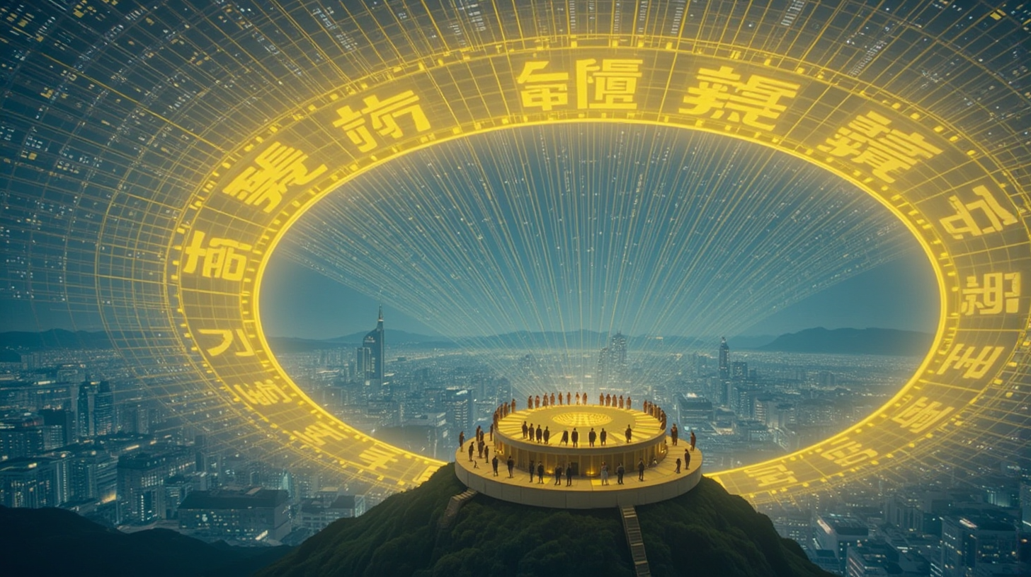 描述:紫金山顶的星环观测站在夜空中展开十二片金色光幕,像一朵盛开在深蓝天幕的花。城市各处,市民佩戴的六朝瓦当神经终端同步亮起,无数细如游丝的生物电信号从街巷升起,在千米高空织成"天下文枢"四个大字。篆字的笔画里流动着南京的记忆数据——有秦淮河的桨声,有天文台的星图,有云锦的纹路,它们在夜风中轻轻晃动,像整座城市在对星空轻声诵读自己的故事。
