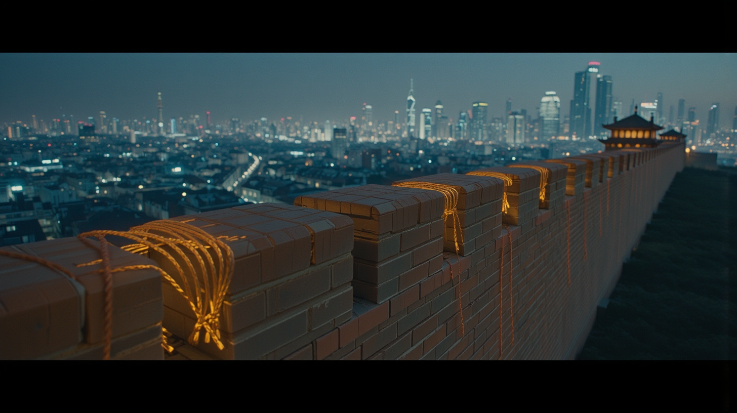 描述:黄昏的明城墙像披了层琥珀色的纱,每块城砖的缝隙都透出呼吸般的柔光。量子投影激活的瞬间,明代工匠扛着石材的身影从砖面浮现,他们的号子声混着远处地铁的轰鸣,在城根下绕成圈。近处,夯土的纹理与玻璃幕墙的霓虹倒影在同一块砖上重叠,六百年的时光仿佛被压进这薄薄一层光晕里,轻轻一碰就会渗出历史的潮气。